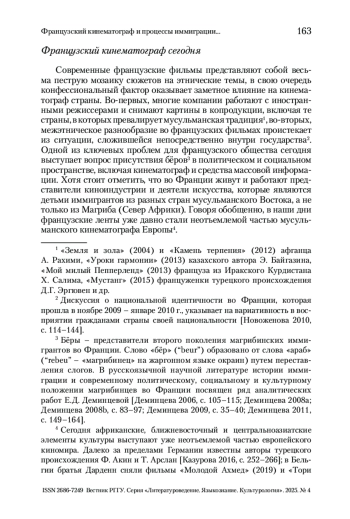 В фокусе исследования – трансформация французского кинематографа под влиянием процессов, неизбежно изменяющих современную культурную среду. Сегодня визуальная культура переосмысляет установленные границы национальных культур и возникающие в этой связи закономерные проблемы современного западного общества. Процессы миграции, классовое расслоение и религиозный плюрализм все больше находят отражение в кинолентах, выдвигая на первый план явления не только политического, социального, но и культурного порядка. Наиболее ярко описываемые изменения проявляются в кинематографе мейнстрима, направленного на широкую аудиторию. Так, созданные французским кинорежиссерами фильмы в стиле “Culture Clash Comedy” призваны примирить зрителей разных религиозных традиций и/или исполнить воспитательную функцию, что приводит к постепенной смене визуальных привычек кинозрителей. Одним из медиаторов новых социальных норм поведения и культурных паттернов поведения выступает школа, а сами фильмы о школе переносят на киноэкраны идею формирования нации по «республиканской модели». Таким образом, школьная тема привлекает внимание режиссеров, а вслед за ними и исследователей кинематографа. В статье представлен последовательный анализ корреляции между процессами иммиграции, влиянием ислама и школьной французской системой на визуальный нарратив французского кинематографа.