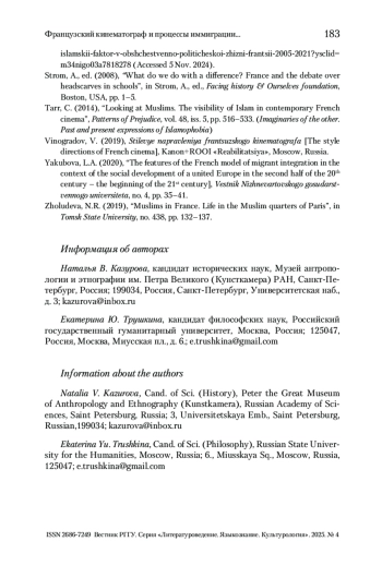 15. Жолудева 2019 - Жолудева Н.Р. Мусульмане во Франции: жизнь мусульманских кварталов Парижа // Вестник Томского гос. ун-та. 2019. № 438. С. 132-137.