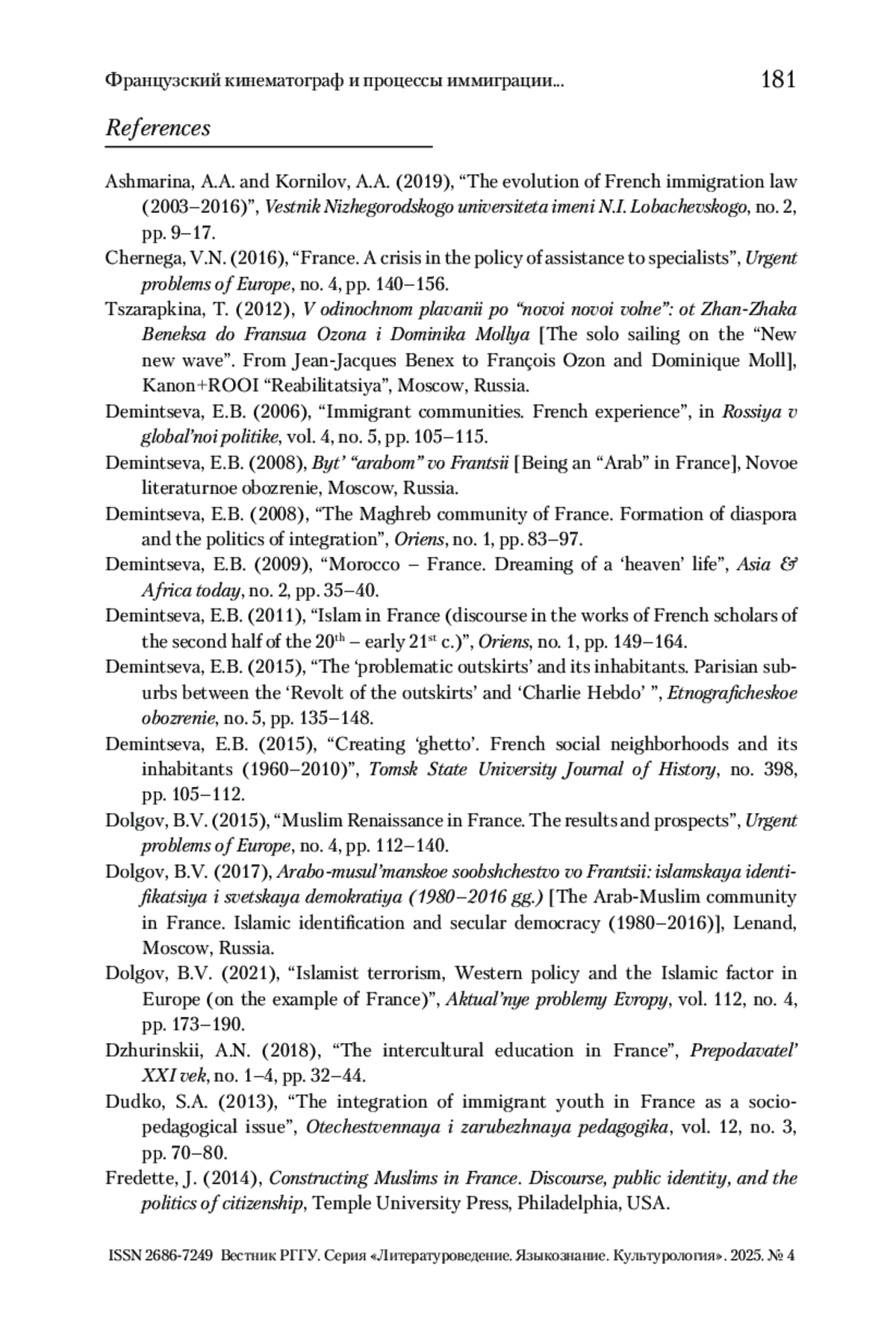 3. Деминцева 2006 - Деминцева Е.Б. Иммигрантские сообщества: опыт Франции // Россия в глобальной политике. 2006. Т. 4. № 5. С. 105-115.