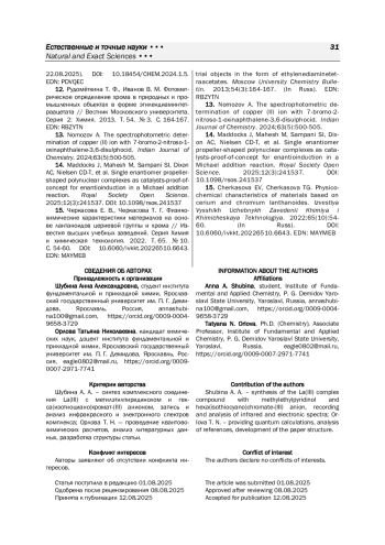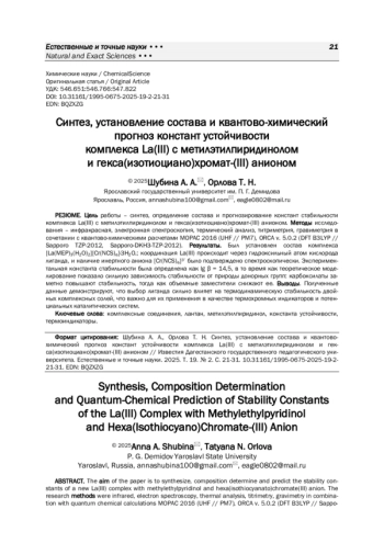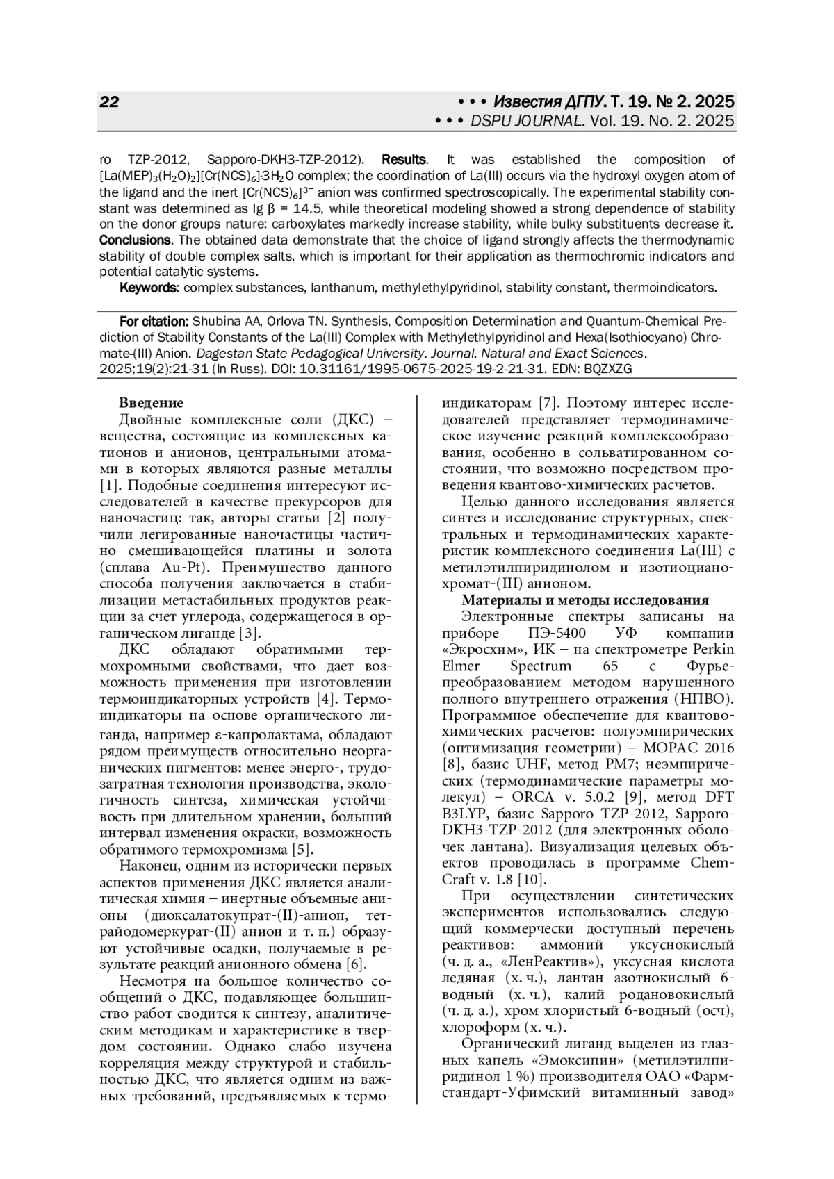 ШУБИНА А. А., ОРЛОВА Т. Н. СИНТЕЗ, УСТАНОВЛЕНИЕ СОСТАВА И КВАНТОВО-ХИМИЧЕСКИЙ ПРОГНОЗ КОНСТАНТ УСТОЙЧИВОСТИ КОМПЛЕКСА LA(III) С МЕТИЛЭТИЛПИРИДИНОЛОМ И ГЕКСА(ИЗОТИОЦИАНО)ХРОМАТ-(III) АНИОНОМ // ИЗВЕСТИЯ ДАГЕСТАНСКОГО ГОСУДАРСТВЕННОГО ПЕДАГОГИЧЕСКОГО УНИВЕРСИТЕТА. ЕСТЕСТВЕННЫЕ И ТОЧНЫЕ НАУКИ. 2025. № 2, ТОМ 19