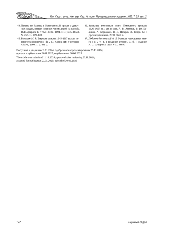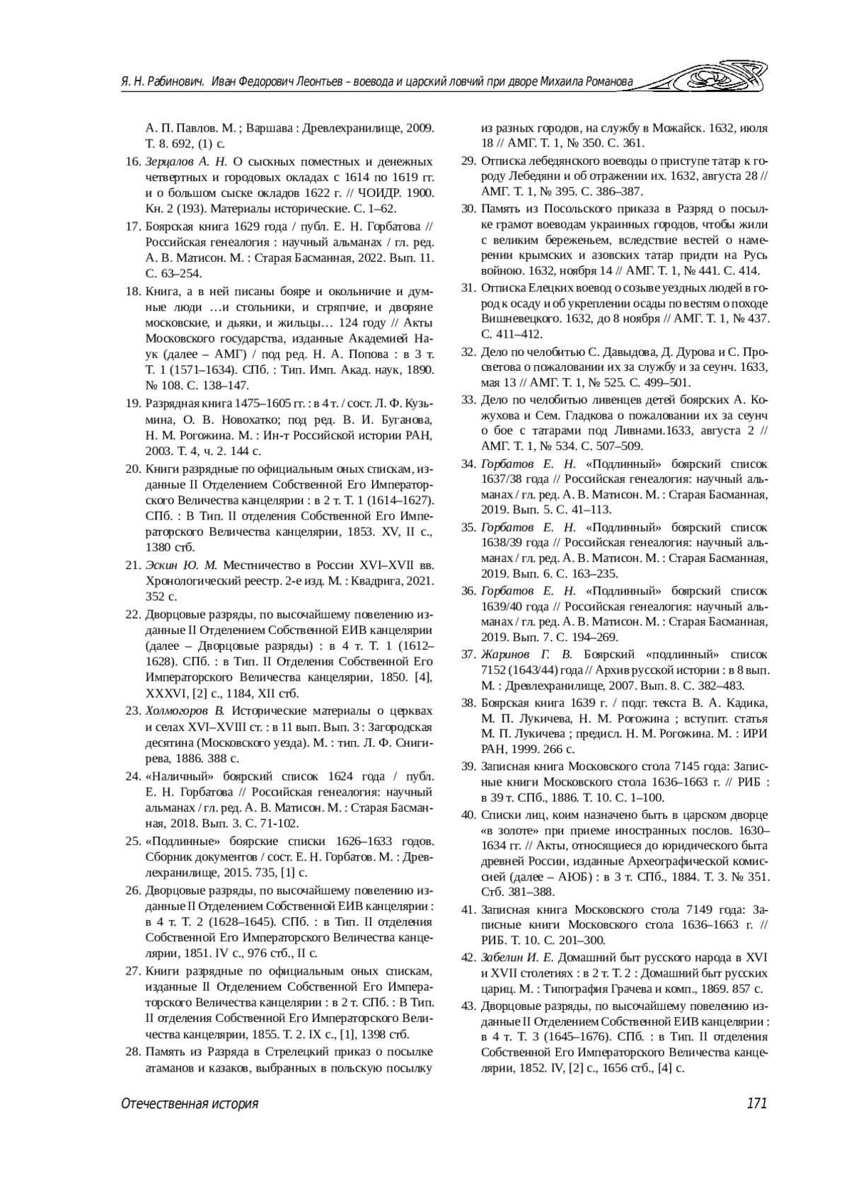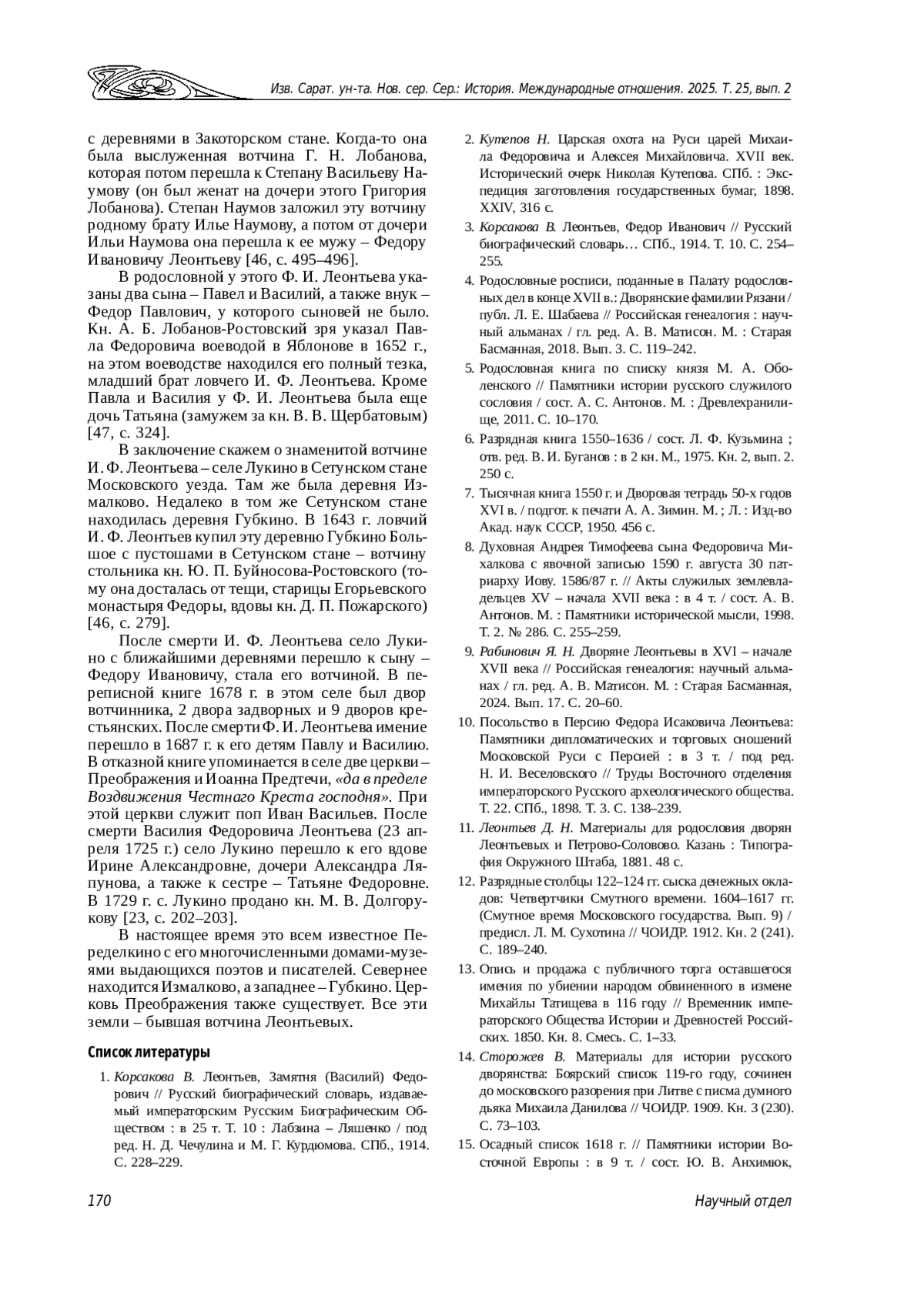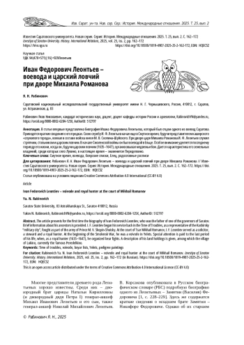 РАБИНОВИЧ Я. Н. ИВАН ФЕДОРОВИЧ ЛЕОНТЬЕВ - ВОЕВОДА И ЦАРСКИЙ ЛОВЧИЙ ПРИ ДВОРЕ МИХАИЛА РОМАНОВА // ИЗВЕСТИЯ САРАТОВСКОГО УНИВЕРСИТЕТА. НОВАЯ СЕРИЯ. СЕРИЯ: ИСТОРИЯ. МЕЖДУНАРОДНЫЕ ОТНОШЕНИЯ. 2025. Т. 25 № 2