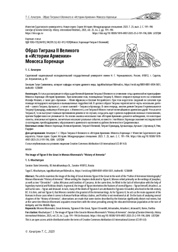 В статье рассматривается образ царя Великой Армении Тиграна II Великого в сочинении «отца армянской историографии» Мовсеса Хоренаци «История Армении». При написании глав, посвященных Тиграну II, Мовсес опирался прежде всего на сочинения Иосифа Флавия, а также две «Хроники» – Юлия Африкана и Евсевия Кесарийского. При этом недостаток сведений он заполнял при помощи легендарного материала и вымышленных подробностей. В целом в образе Тиграна переплетаются черты нескольких деятелей – самого Тиграна, Арташеса I, а также сыновей – Тиграна и Артавазда. В свою очередь, многие деяния Тиграна II приписываются Тиграну I Ервандиду, жившему в VI веке до н. э. Именно его, а не Тиграна II Мовсес считает величайшим из армянских царей. Что касается Тиграна II, то он выступает главным противником римлян в тех случаях, когда речь идет о римско-парфянских военных столкновениях, причем Парфия вовсе не упоминается. На основе анализа нескольких глав «Истории Армении» делаются наблюдения, что некоторые сюжеты, описанные историком, значительно искажают реальные события, но вместе с тем Мовсес Хоренаци знакомит исследователей со взглядами, преобладавшими у образованного армянского населения на рубеже Античности и Средневековья.