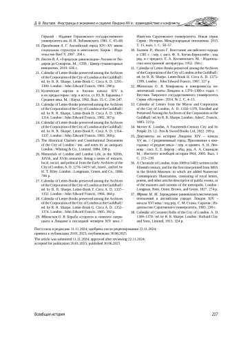 35. Документы по истории Лондона XIV - начала XV вв. // Средневековый город. Приложение к ежегоднику “Средние века” / пер. и примеч. А. Н. Леонова; сост. Е. Е. Бергер; общ. ред. А. А. Сванидзе. М.: Институт всеобщей истории РАН, 2005. Вып. 1 С. 211-230.