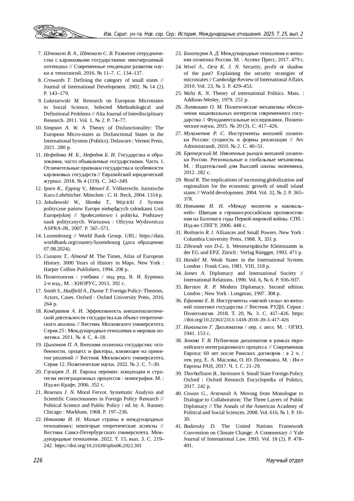 22. Новикова И. Н. Малые страны в международных отношениях: некоторые теоретические аспекты // Вестник Санкт-Петербургского университета. Международные отношения. 2022. Т. 15, вып. 3. С. 219-242. DOI: 10.21638/spbu06.2022.301 EDN: EHMKUH