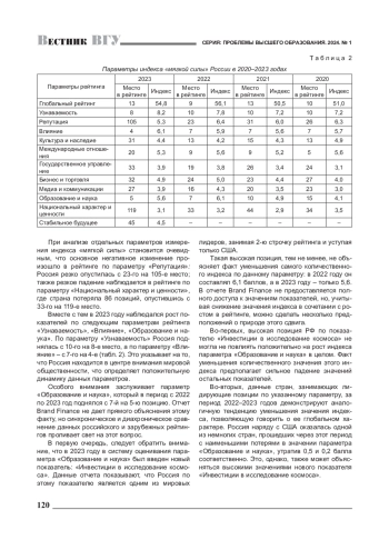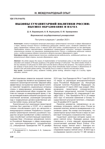 Статья посвящена вопросам реализации гуманитарной политики в сфере образования и науки, анализу позиций России в глобальных рейтингах «мягкой силы», динамике изменений ключевых параметров ««мягкой силы» в период 2020-2023 годов и воздействующим на нее факторам. Представлен анализ перспективных направлений гуманитарной политики, которые оказывают значительное влияние на повышение привлекательности России в глобальном рейтинге «мягкой силы», особое внимание уделено политике в области высшего образования и науки.
