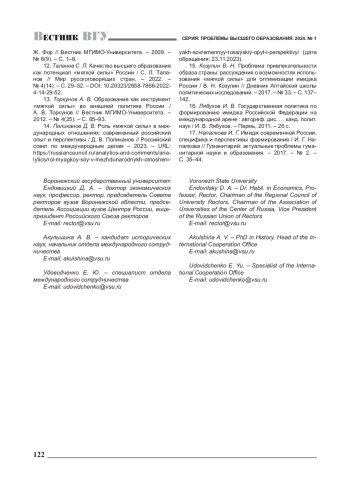 12. Таланов С. Л. Качество высшего образования как потенциал “мягкой силы” России / С. Л. Таланов // Мир русскоговорящих стран. - 2022. -№ 4(14). - С. 29-52. -. DOI: 10.20323/2658-7866-20224-14-29-52 EDN: OZHTED