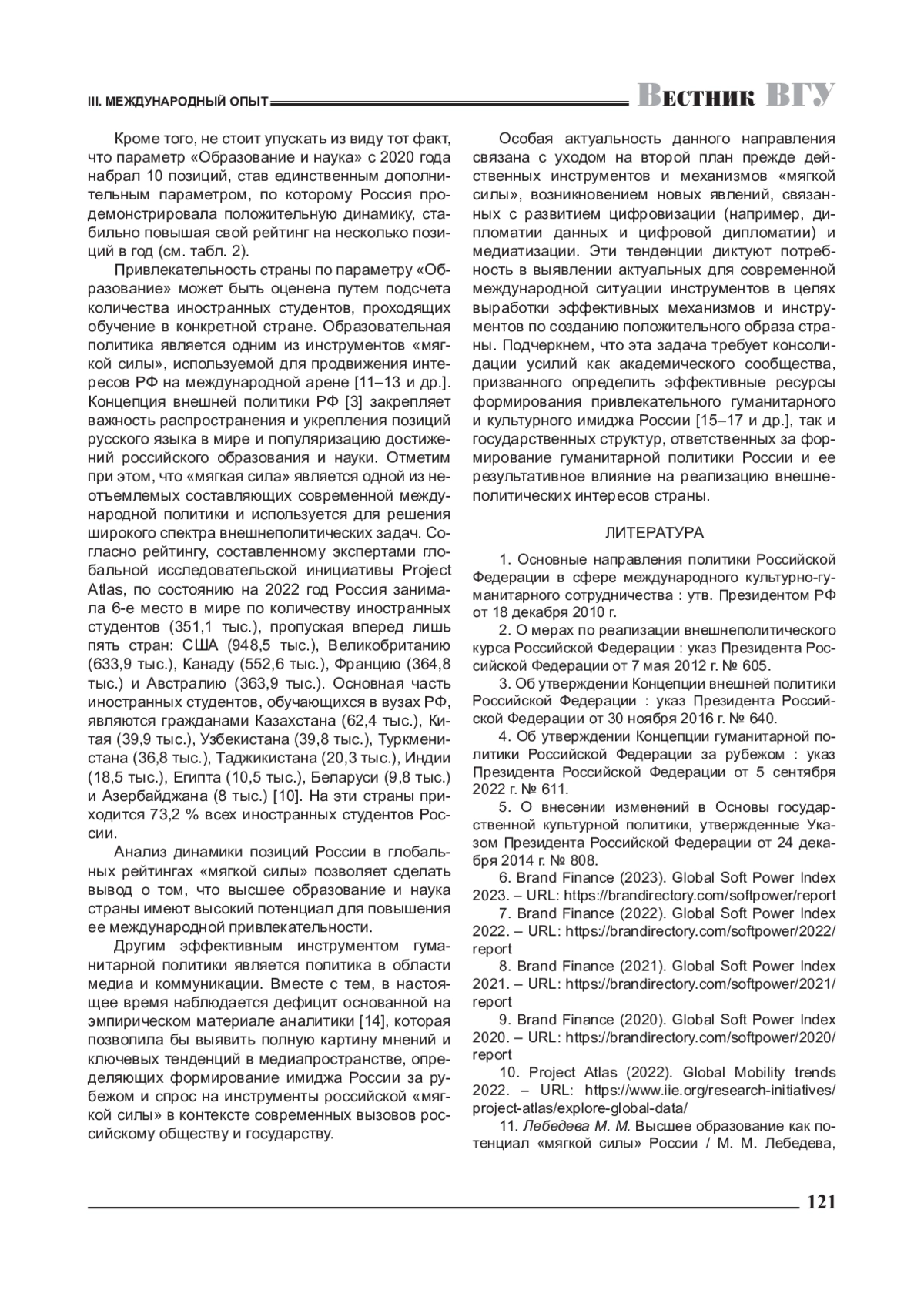 11. Лебедева М. М. Высшее образование как потенциал “мягкой силы” России / М. М. Лебедева, Ж. Фор // Вестник МГИМО-Университета. - 2009. -№ 6(9). - С. 1-6. EDN: KYGTAF