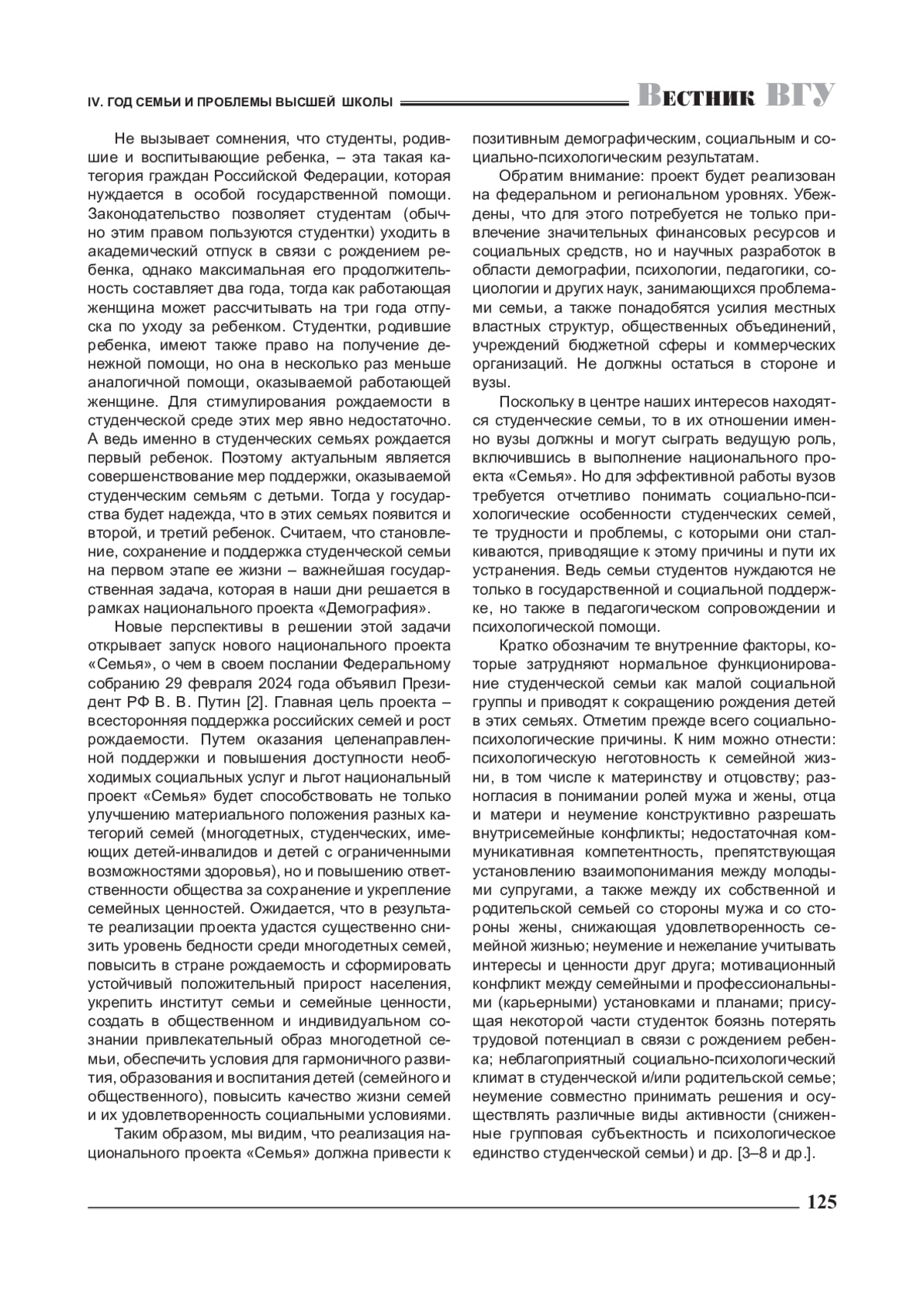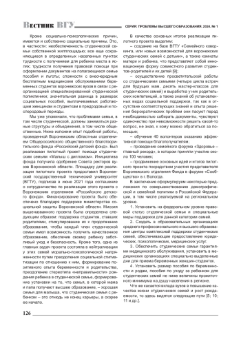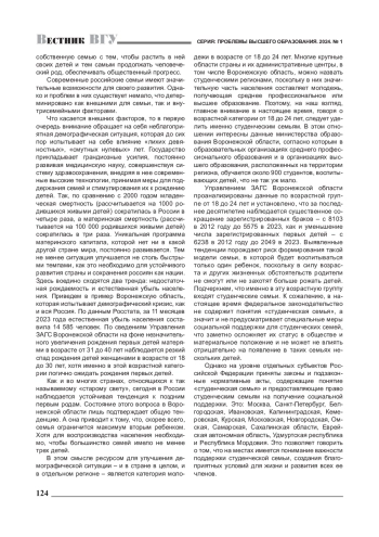 В статье поднимается важнейшая социальная и социально-психологическая проблема поддержки студенческих семей, которая приобретает особое значение в Год семьи в Российской Федерации. Представлен комплексный анализ проблемы в ее демографических, социальных, социально-психологических и иных аспектах. С опорой на статистические данные авторы показывают значимость решения разнообразных проблем семьи вообще и студенческой семьи в частности для обеспечения стабильного поступательного развития страны. На примере проекта, реализованного региональным отделением «Российского детского фонда», и основных направлений работы со студенческими семьями в вузах показаны возможные практические пути решения проблемы создания, укрепления и поддержки студенческих семей.