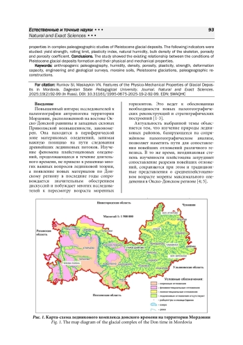Целью исследования является анализ ряда физико-механических свойств плейстоценовых гляциальных отложений на территории Мордовии. Изучение природы ледниковых районов, базирую-щееся на сопряжённом палеогеографическом анализе, позволяет наметить пути для корреляции разно-генетических типов новейших отложений, а специфика каждого региона Русской равнины помогает понять главные закономерности развития природных комплексов. При палеогеографических рекон-струкциях и стратиграфических построениях для каждого генетического типа отложений используется определённый набор наиболее информативных способов сбора информации. Методы. В соответствии с поставленной целью авторами использовались следующие методы изучения физико-механических свойств ледниковых отложений: исследование предела текучести, предела раскатывания, числа пла-стичности, естественной влажности, объёмного веса скелета, пористости и коэффициента пористости. Результаты. Показана правомерность использования физико-механических свойств в комплексных палеогеографических исследованиях плейстоценовых ледниковых отложений. Выводы. Проведённое исследование показало существующую связь между условиями образования плейстоценовых леднико-вых отложений и их физико-механическими свойствами.