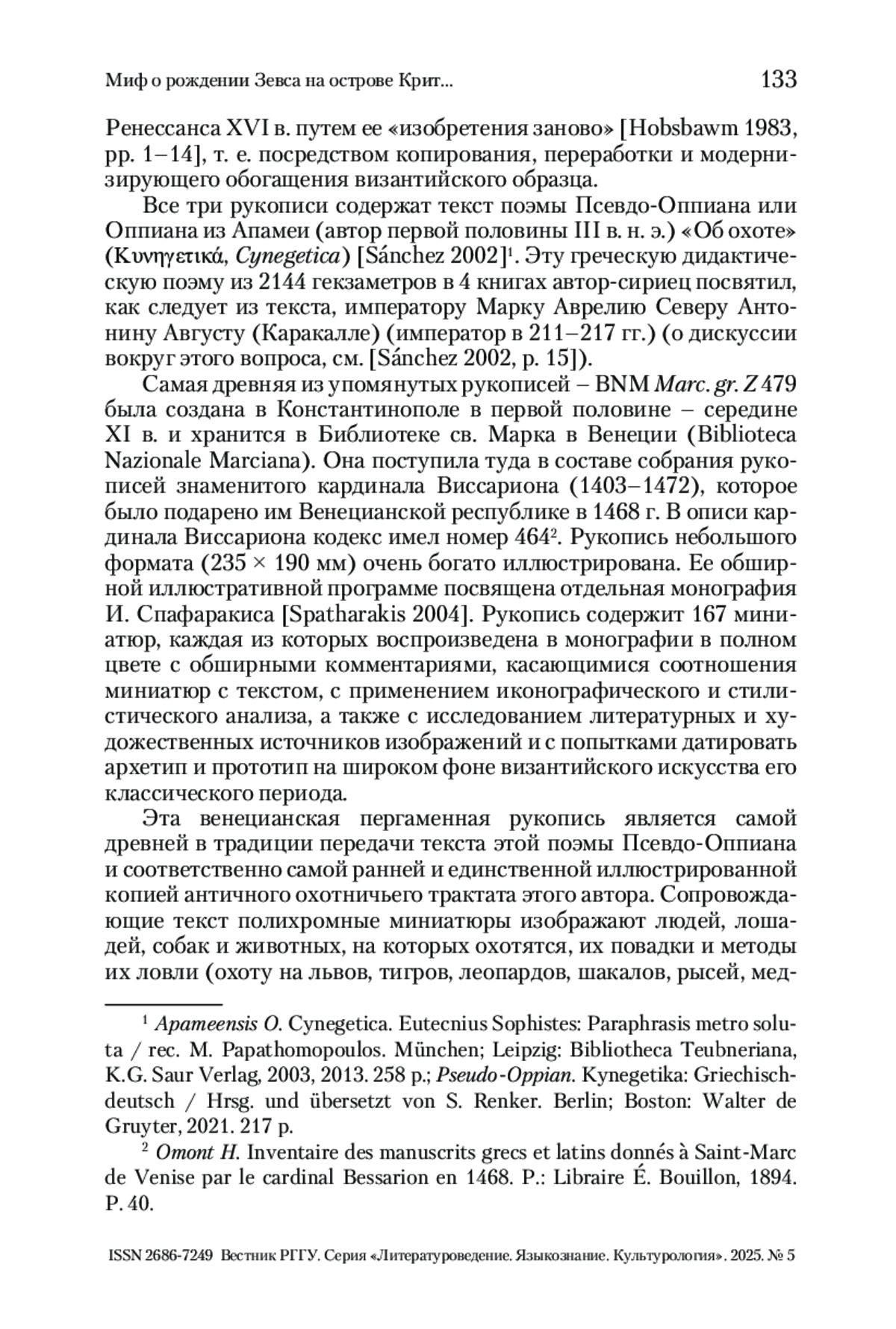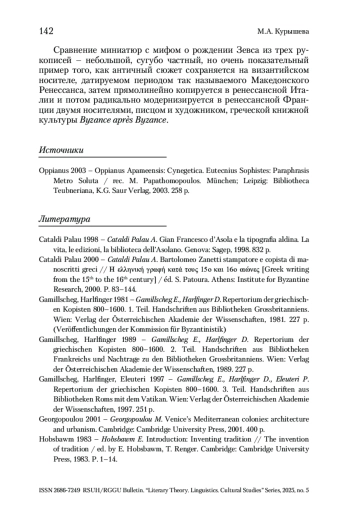 В статье рассматриваются три миниатюры, изображающие миф о рождении Зевса на острове Крит, из трех разных греческих рукописей. Оригинальное изображение находится в византийской рукописи XI в., содержащей античный текст дидактической поэмы об охоте Кинегетика Оппиана из Апамеи III в. н. э. Вторая миниатюра, которая является ее копией, находится в ренессансной итальянской рукописи XVI в. венецианского писца Бартоломео Занетти. Третья миниатюра, скопированная в Париже в 1554 г. анонимным миниатюристом, работавшим вместе со знаменитым каллиграфом критского происхождения Ангелосом Вергикиосом, с итальянской копии, кардинально меняет художественное решение протографа. В итоге миниатюра парижской рукописи превращается в настоящий картоид, вписывающий в мифологическое пространство Крита элементы его актуальной географии – крупнейшие города времени господства над островом Венеции. Византийское изображение перерабатывается в ренессансный мини-шедевр.