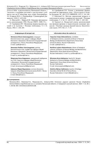 13. Новикова Л.А., Васюков В.М., Горбушина Т.В., Пчелинцева Т.И. Фитоценотическое значение Cephalaria litvinovii Bobr. в растительности Пензенской области // Экология и география растений и растительных сообществ: мат-лы IV междунар. науч. конф. (Екатеринбург, 16-19 апреля 2018 г.). Екатеринбург: Гуманитарный университет, 2018. С. 619-624. EDN: UVLMSP