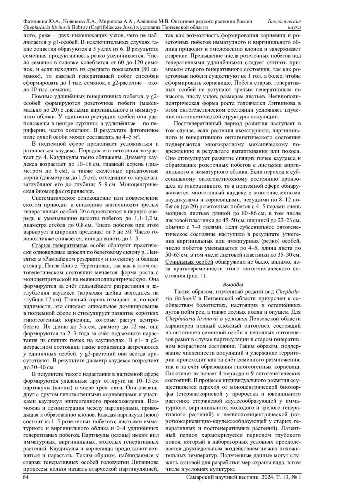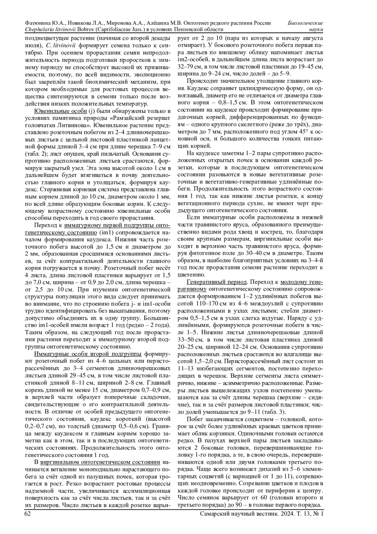 В статье рассматриваются особенности онтогенеза, формирования биоморфы (в онтогенетическом аспекте) и фитоценотическая приуроченность в условиях Пензенской области редкого растения России эндемика головчатки Литвинова Chephalaria litvinovii Bobrov. Методы полевых исследований дополняются лабораторным экспериментом по влиянию низких положительных температур на всхожесть семянок. Проведенные исследования показали, что индивидуальное развитие особей этого вида включает 4 периода и 9 онтогенетических состояний, морфометрические показатели которых представлены в работе. Показано, как моноцентрическая биоморфа этого каудексного поликарпика в старом генеративном возрастном состоянии сменяется неявнополицентрической за счёт формирования гипогеогенных корневищ. Показано стимулирующее действие температуры +2°C в течение 2 недель на всхожесть семянок. Отмечается фитоценотическая приуроченность C. litvinovii к болотистым и реже - к настоящим и остепнённым лугам в поймах рек, а также по лесным полянам и опушкам. Полученные материалы могут служить основой для разработки более эффективных мероприятий по охране вида, в том числе в условиях культуры при интродукции в условиях ботанических садов.