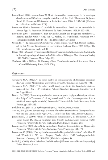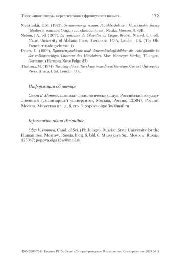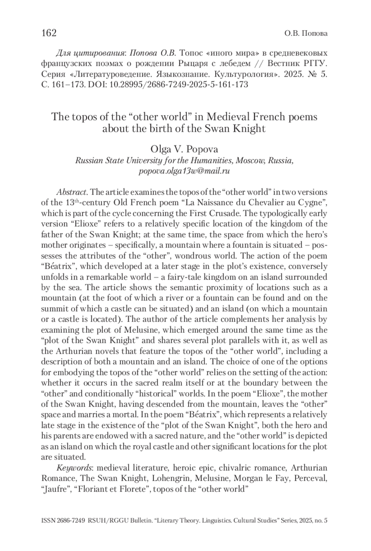 ПОПОВА О. В. ТОПОС «ИНОГО МИРА» В СРЕДНЕВЕКОВЫХ ФРАНЦУЗСКИХ ПОЭМАХ О РОЖДЕНИИ РЫЦАРЯ С ЛЕБЕДЕМ // ВЕСТНИК РГГУ. СЕРИЯ «ЛИТЕРАТУРОВЕДЕНИЕ. ЯЗЫКОЗНАНИЕ. КУЛЬТУРОЛОГИЯ». 2025. № 5