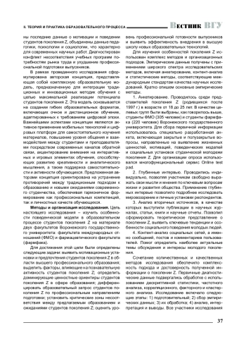 Статья посвящена изучению особенностей поведения, мотивации и восприятия образовательного процесса студентами поколения Z. Проведен масштабный опрос среди студентов Воронежского государственного университета, целью которого было выявление ключевых факторов, влияющих на уровень мотивации, понимание авторитетов и кумиров современной молодежи, отношение к образовательному процессу и информационным ресурсам. Проанализированы также восприятие студентами образовательной среды и их карьерные ожидания.