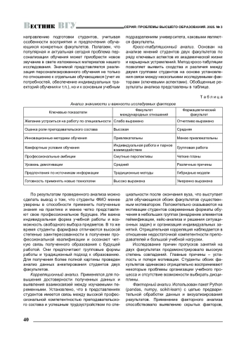 Использование методов кластеризации позволило дифференцировать группы (кластеры) студентов на основе их предпочтений и ожиданий. С этой целью был использован алгоритм K-средних (K-means clustering), позволяющий разбить выборку на заранее заданное число кластеров таким образом, чтобы минимизировать внутригрупповую вариабельность. По итогам кластеризации были выделены три группы студентов с похожими характеристиками, такими как: высокая мотивация и ориентация на профессию; скептическое отношение к качеству образования; творческий подход и стремление к инновациям. Формирование кластеров дает возможность предложить персонализированные образовательные стратегии, повышающие общий уровень удовлетворенности студентов качеством получаемого образования. Предложены меры по совершенствованию образовательного процесса, включая повышение квалификации преподавателей и интеграцию современных методик обучения.