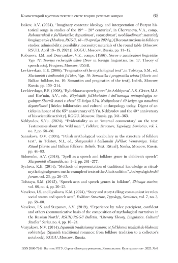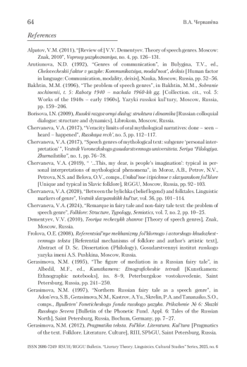 6. Веселова, Степанов 2019 - Веселова И.С., Степанов А.В. Опыт по ролям: перципиент, конфидент и другие (коммуникативные основы композиции мифологических нарративов Русского Севера) // Вестник РГГУ. Серия «Литературоведение. Языкознание. Культурология». 2019. № 4. С. 10-24.