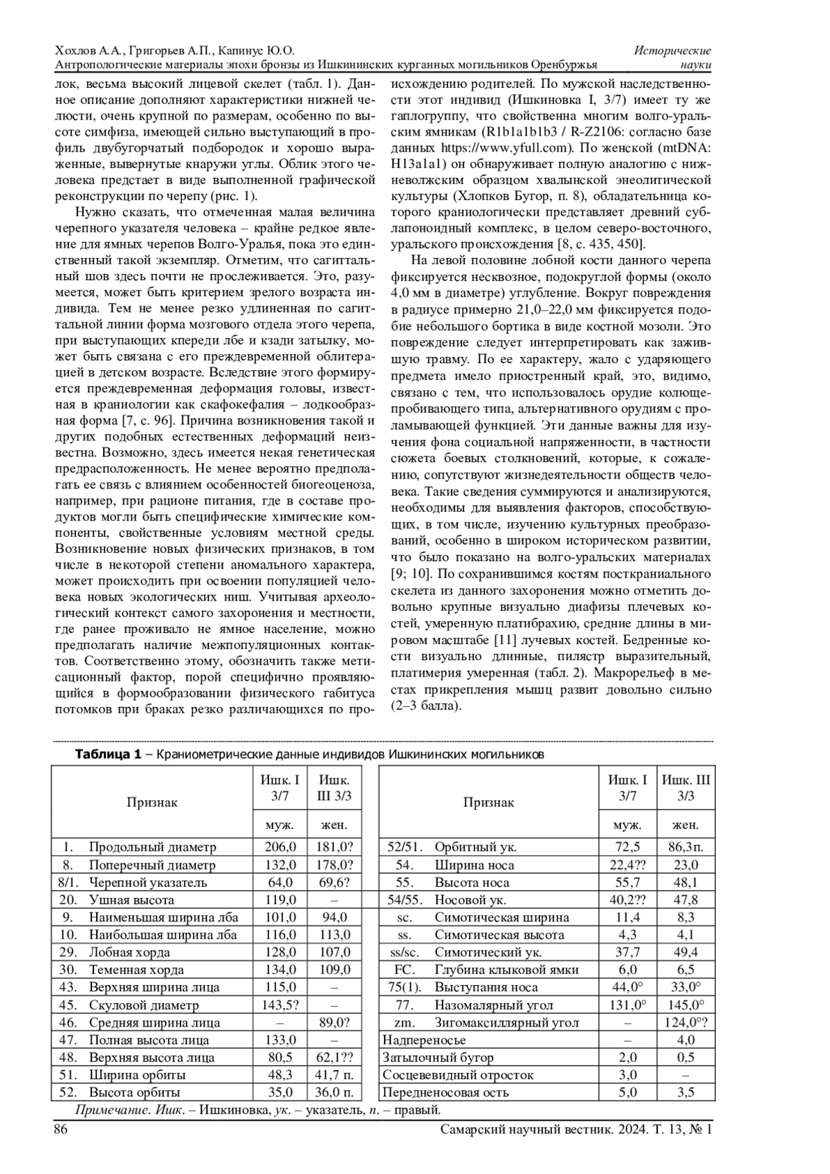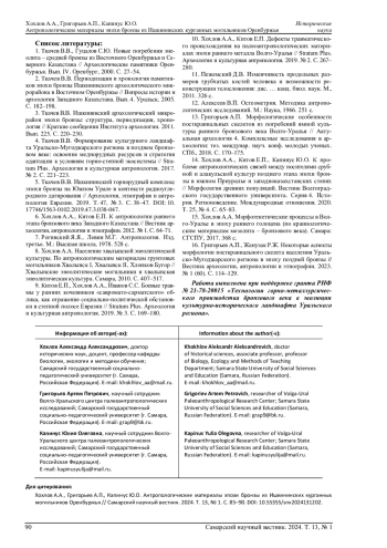 ХОХЛОВ А. А., ГРИГОРЬЕВ А. П., КАПИНУС Ю. О. АНТРОПОЛОГИЧЕСКИЕ МАТЕРИАЛЫ ЭПОХИ БРОНЗЫ ИЗ ИШКИНИНСКИХ КУРГАННЫХ МОГИЛЬНИКОВ ОРЕНБУРЖЬЯ // САМАРСКИЙ НАУЧНЫЙ ВЕСТНИК. 2024. ТОМ 13, № 1