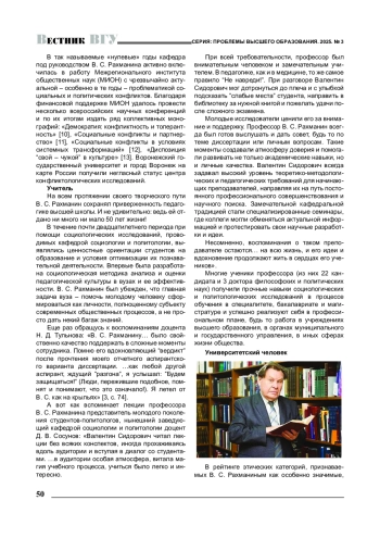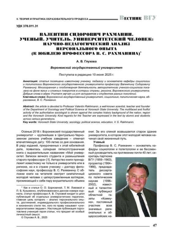 Статья посвящена известному ученому, педагогу и основателю кафедры социологии и политологии Воронежского государственного университета профессору Валентину Сидоровичу Рахманину Многогранная и плодотворная деятельность авторитетного ученого-социолога показана на фоне ярких и сложных поворотов в истории страны, региона, Воронежского университета. Добрые слова в адрес Учителя звучат из уст аспирантов и студентов разных поколений.