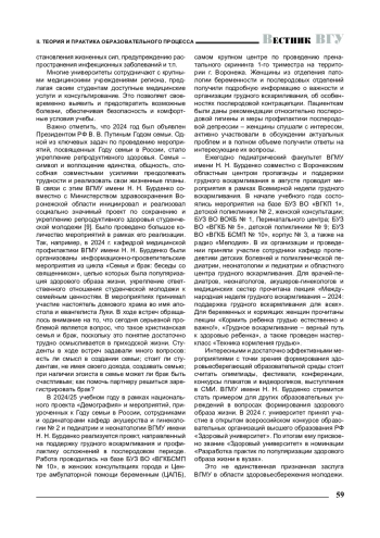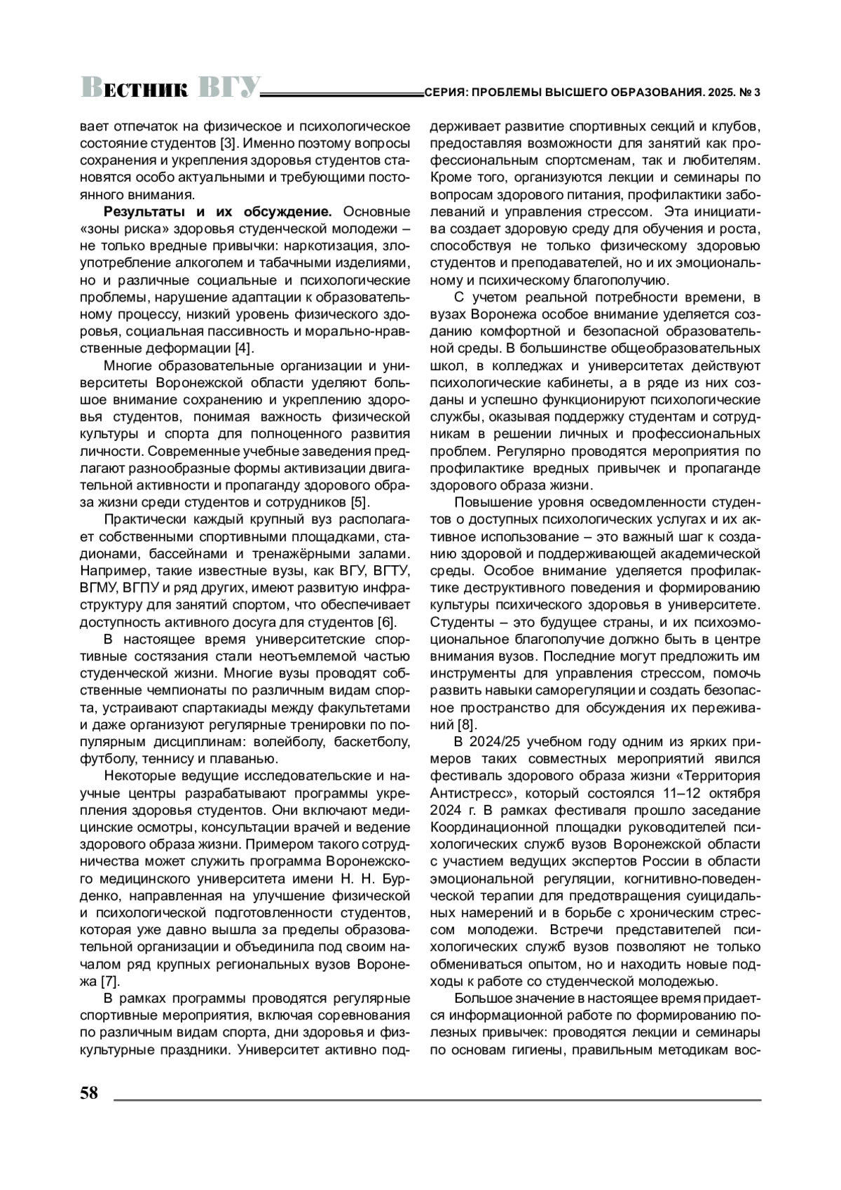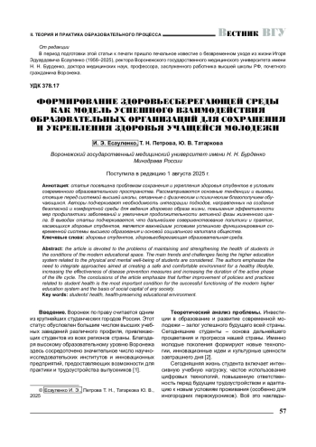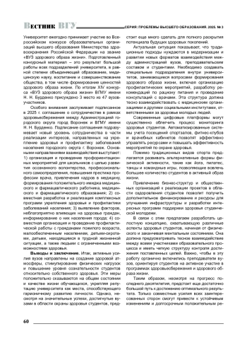 ТАТАРКОВА Ю. В., ПЕТРОВА Т. Н., ЕСАУЛЕНКО И. Э. ФОРМИРОВАНИЕ ЗДОРОВЬЕСБЕРЕГАЮЩЕЙ СРЕДЫ КАК МОДЕЛЬ УСПЕШНОГО ВЗАИМОДЕЙСТВИЯ ОБРАЗОВАТЕЛЬНЫХ ОРГАНИЗАЦИЙ ДЛЯ СОХРАНЕНИЯ И УКРЕПЛЕНИЯ ЗДОРОВЬЯ УЧАЩЕЙСЯ МОЛОДЕЖИ // ВЕСТНИК ВОРОНЕЖСКОГО ГОСУДАРСТВЕННОГО УНИВЕРСИТЕТА. СЕРИЯ: ПРОБЛЕМЫ ВЫСШЕГО ОБРАЗОВАНИЯ. 2025. № 3