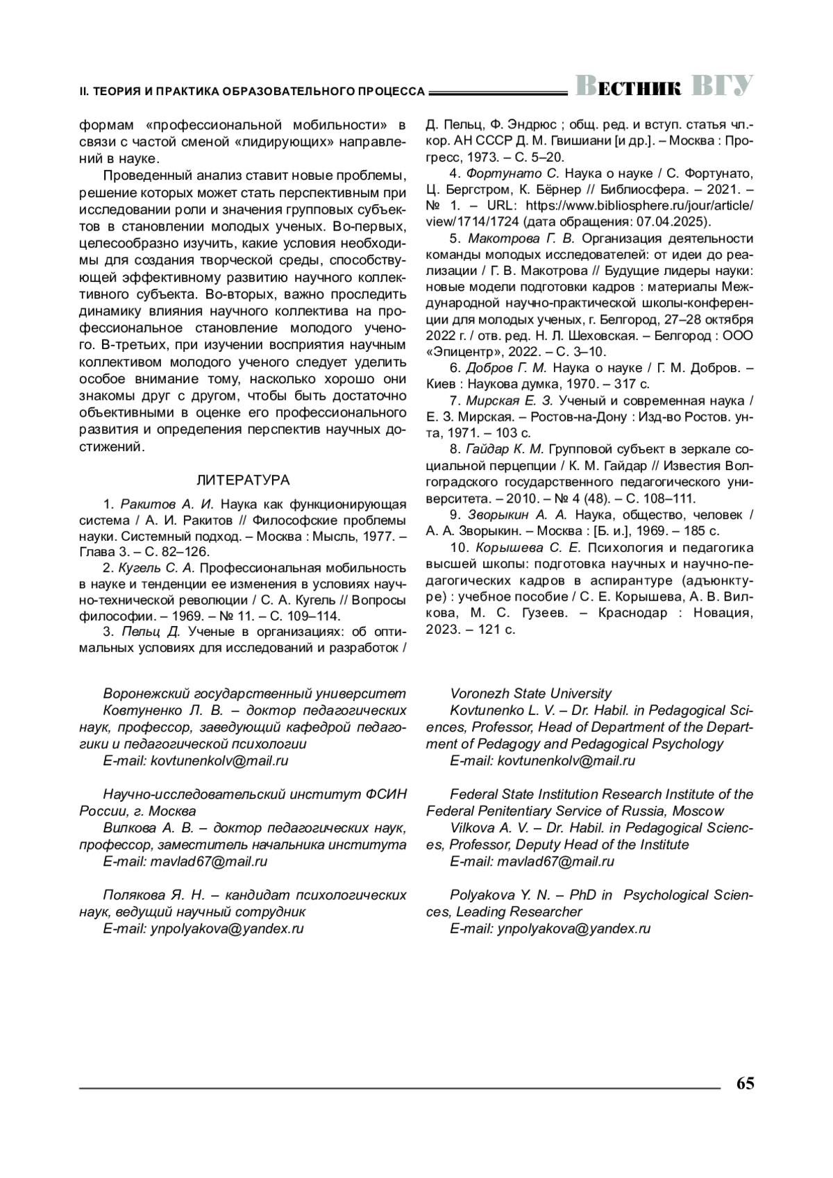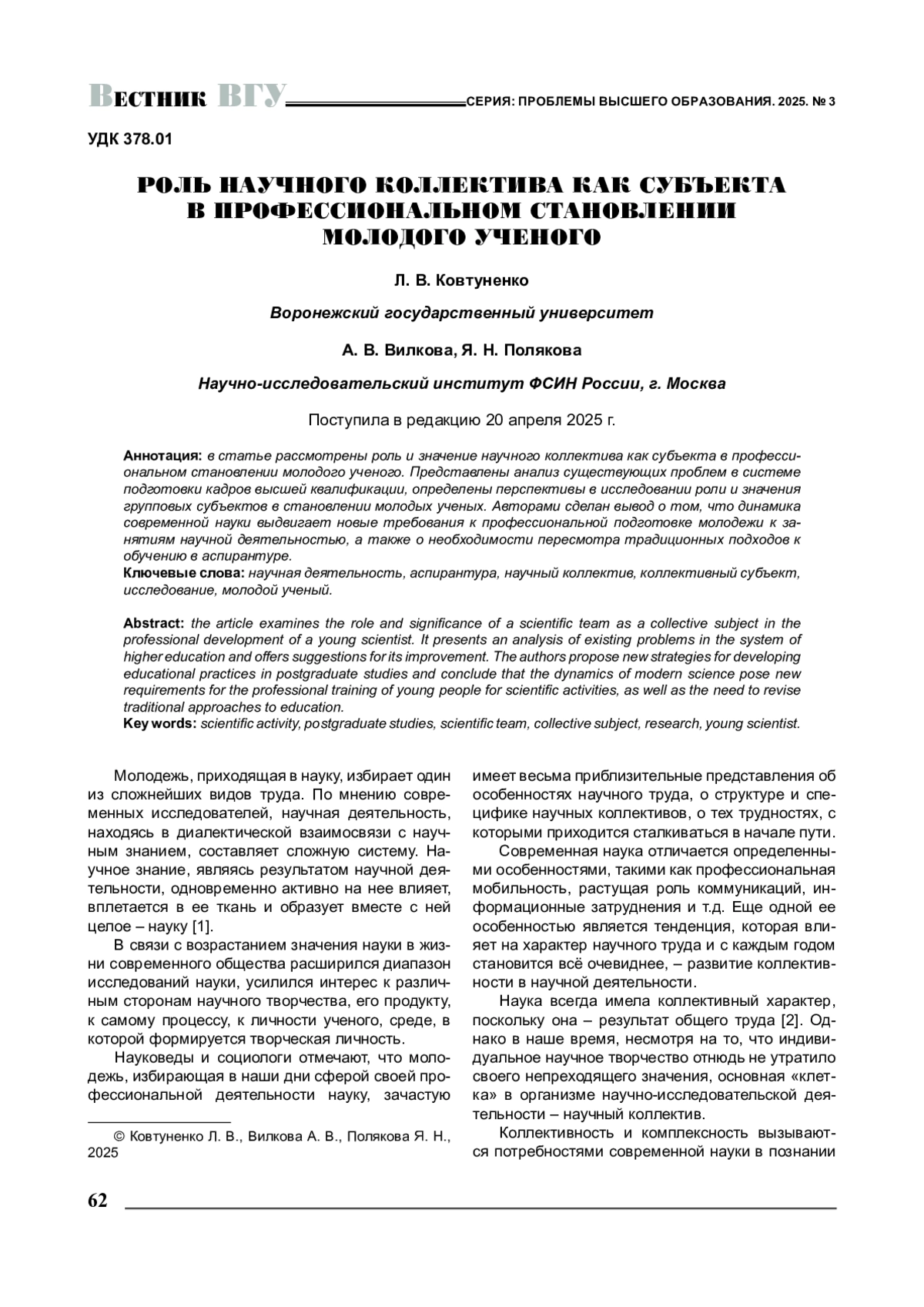 КОВТУНЕНКО Л. В., ПОЛЯКОВА Я. Н., ВИЛКОВА А. В. РОЛЬ НАУЧНОГО КОЛЛЕКТИВА КАК СУБЪЕКТА В ПРОФЕССИОНАЛЬНОМ СТАНОВЛЕНИИ МОЛОДОГО УЧЕНОГО // ВЕСТНИК ВОРОНЕЖСКОГО ГОСУДАРСТВЕННОГО УНИВЕРСИТЕТА. СЕРИЯ: ПРОБЛЕМЫ ВЫСШЕГО ОБРАЗОВАНИЯ. 2025. № 3