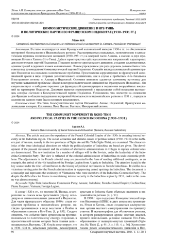 В статье анализируется опыт Французской колониальной империи 1930-х гг. по обеспечению внутренней безопасности в Индокитайском регионе. Рассматриваются социальные, экономические и климатические причины политических волнений (1930-1931 гг.) в северной части Аннама, а именно в двух провинциях Нгеан и Хатинь (Нге-Тинь). Даётся характеристика трёх идеологических направлений, характерных для политических партий Индокитая. Показано развитие крестьянского движения, создание альтернативных администраций в деревнях взамен колониальных. Новым учреждением для ряда деревень должны были стать советы под руководством Коммунистической партии Индокитая. Отражён взгляд колониальной администрации Индокитая на социально-экономические проблемы. Представлены корректировки во французской колониальной армии в виде отправки дополнительного контингента, как в случае с прибытием 4-го батальона Иностранного легиона из Алжира в Индокитай. Основное внимание уделяется ключевому источнику для изучения заявленной проблемы: «Вклад в историю политических движений во Французском Индокитае». Он свидетельствует о победном переломе для французской администрации в подавлении вооружённых восстаний на территории Индокитая. Документ является стенограммой и представляет собой показания вьетнамцев, которые состояли в Коммунистической партии Индокитая. Установлено, что, несмотря на сложности для Франции в области поддержания внутренней безопасности в индокитайском регионе к 1931 г., порядок в колонии на данном этапе был в основном восстановлен.