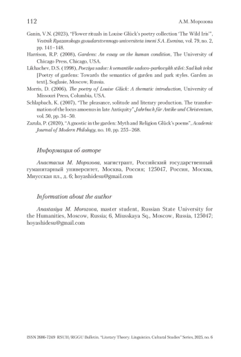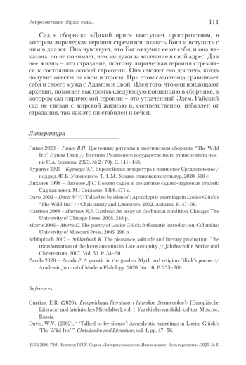 В поэтическом сборнике «Дикий ирис» пространство сада становится важным образом – связующим звеном между всеми стихотворениями, позволяющим создать этот цикл. Л. Глик конструирует герметичное пространство сада, обладающее идиллическими характеристиками, которое я предлагаю рассматривать как топос «прелестный уголок» (Э. Р. Курциус). Определение Э. Р. Курциуса показывает соответствующую многогранность топоса, которая характерна для сада в «Диком ирисе» и выражается в его двойственности. Таким образом, в статье сад рассматривается не только как стилистический, но и структурный элемент цикла в американской поэзии второй половины ХХ в.