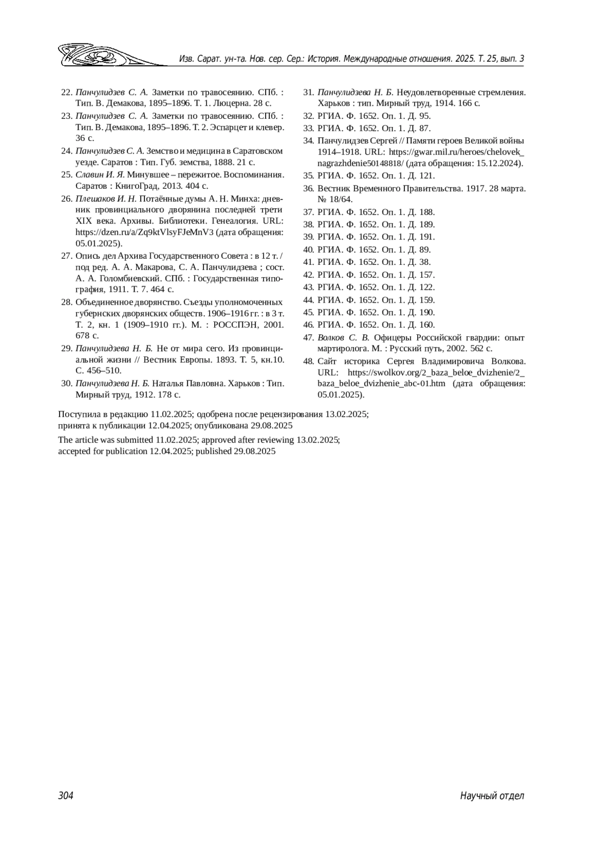 15. Белоусов С. В., Букреева Е. М. Пензенский губернатор Александр Алексеевич Панчулидзев: портрет на фоне эпохи // Отечественная война 1812 года: Источники. Памятники. Проблемы: материалы XXVI Международной научной конференции, 5-7 сентября 2022 г. / сост. И. В. Корнеев. Бородино: Государственный Бородинский военно-исторический музей-заповедник, 2023. С. 368-376. EDN: FNWAZB