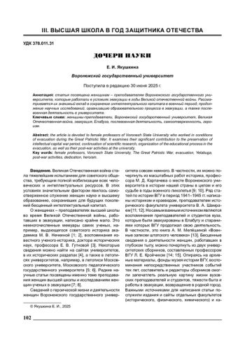 Ключевые фразы: женщины-преподаватели, ВОРОНЕЖСКИЙ ГОСУДАРСТВЕННЫЙ УНИВЕРСИТЕТ, ВЕЛИКАЯ ОТЕЧЕСТВЕННАЯ ВОЙНА, эвакуация, елабуга, послевоенная деятельность, самоотверженность, ГЕРОИЗМ