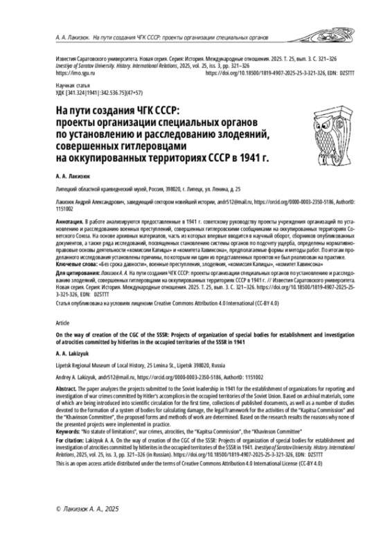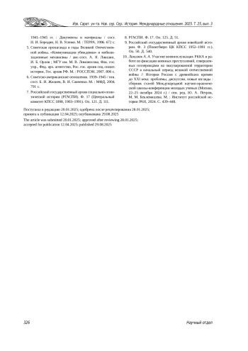 10. Лакизюк А. А. Участие военнослужащих РККА в работе по фиксации военных преступлений, совершенных гитлеровцами на оккупированной территории СССР в начальный период великой отечественной войны // История России с древнейших времен до XXI века: проблемы, дискуссии, новые взгляды: сборник статей Международной научно-практической школы-конференции молодых ученых (Москва, 22-25 октября 2024 г.) / отв. ред. Ю. А. Петров, М. М. Беклемишева. М.: Институт российской истории РАН, 2024. С. 439-448. EDN: CUSGEN