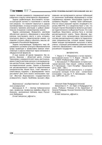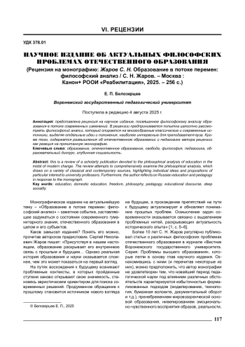1. Жаров С. Н. Образование в потоке перемен : философский анализ / С. Н. Жаров. - Москва : Канон+ РООИ «Реабилитация», 2025. - 256 с.