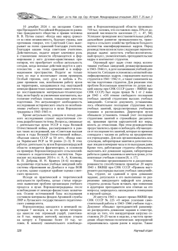 В статье выявляются и анализируются проблемы организации учебного процесса в вузах Ворошиловградщины в 1943–1945 гг. Отмечается, что высшие учебные заведения области были реэвакуированы и приступили к налаживанию учебной работы, которая осложнялась медленным восстановлением материально-технической базы, задействованностью студентов на производстве и мобилизацией на различные работы, а также трансформацией учебных планов. Показано, что мероприятия по возобновлению учебной деятельности ложились на плечи профессорско-преподавательского состава, для которого была характерна неукомплектованность и низкий уровень качественного состава. Это приводило к увеличению нагрузки, невыполнению учебных планов, снижению качества знаний студентов. Утверждается, что с 1944 г. начинается постепенное увеличение контингента студентов, который характеризовался преобладанием младших курсов, доминированием женщин и неоднородным составом.