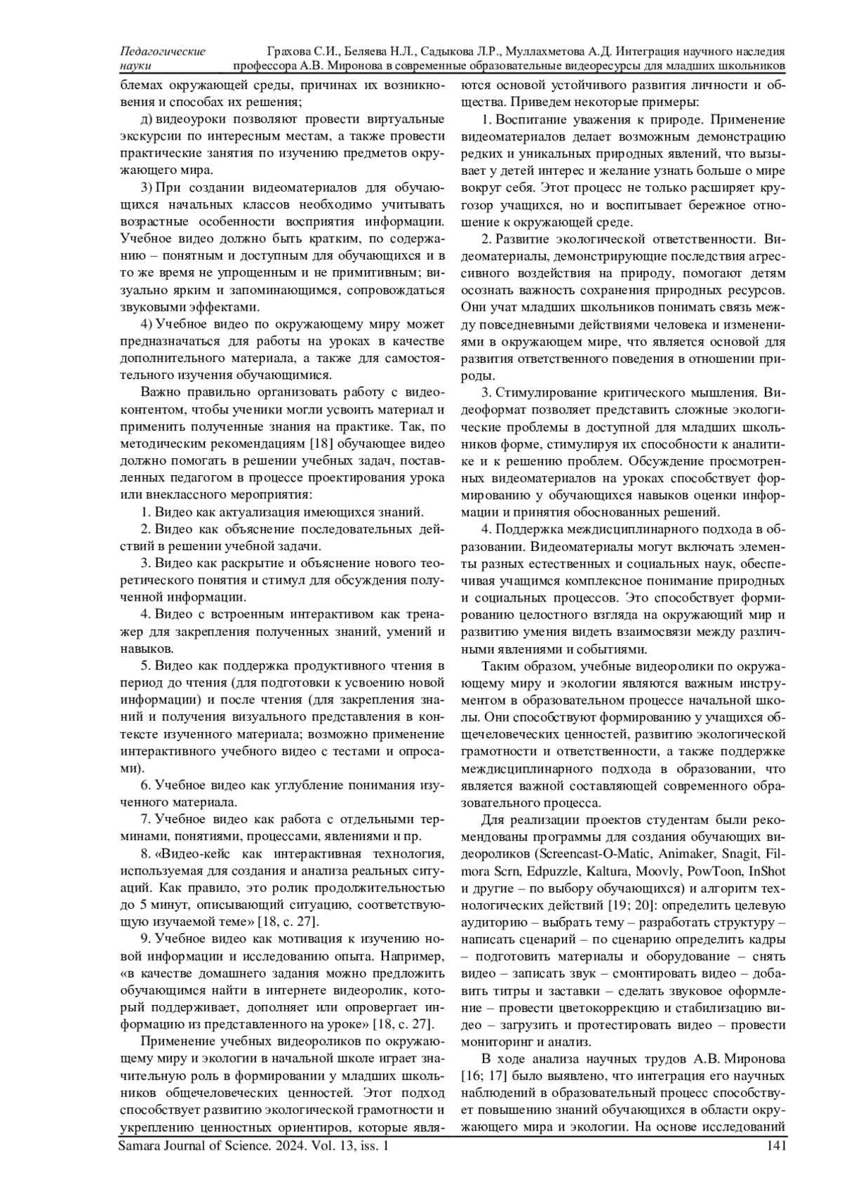 ГРАХОВА С. И., БЕЛЯЕВА Н. Л., САДЫКОВА Л. Р., МУЛЛАХМЕТОВА А. Д. ИНТЕГРАЦИЯ НАУЧНОГО НАСЛЕДИЯ ПРОФЕССОРА А. В. МИРОНОВА В СОВРЕМЕННЫЕ ОБРАЗОВАТЕЛЬНЫЕ ВИДЕОРЕСУРСЫ ДЛЯ МЛАДШИХ ШКОЛЬНИКОВ // САМАРСКИЙ НАУЧНЫЙ ВЕСТНИК. 2024. ТОМ 13, № 1
