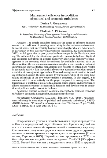 В статье рассматривается проблематика эффективного ведения хозяйственной деятельности в условиях роста неопределенности деловой среды. В последние годы эта неопределенность резко повысилась, что определяется, в частности, двумя последовательными макрошоками (пандемический, 2020 г. и санкционный, 2022 г.), которые породили слабопредсказуемые изменения в российской экономике. Авторами эта ситуация определена как политико-экономическая турбулентность. Политико-экономическая турбулентность в целом негативно влияет на эффективность управления в экономике, что подтверждается имеющимися статистическими данными. В то же время, есть многочисленные контрпримеры, когда даже в турбулентной среде за счет эффективного управления удается получать высокие результаты в хозяйственной деятельности. Показано, что сложившиеся условия хозяйствования требуют пересмотра подходов к управлению. Обновленное управление должно быть ориентировано на защиту от рисков, вызванных турбулентностью, и, одновременно, на использование порождаемых ею новых возможностей. Рекомендовано, в этой связи, более активно использовать проектный подход в управлении. Формирование сбалансированного по рискам и результативности портфеля проектов позволяет экономическим системам успешно функционировать и развиваться даже в условиях политико-экономической турбулентности.