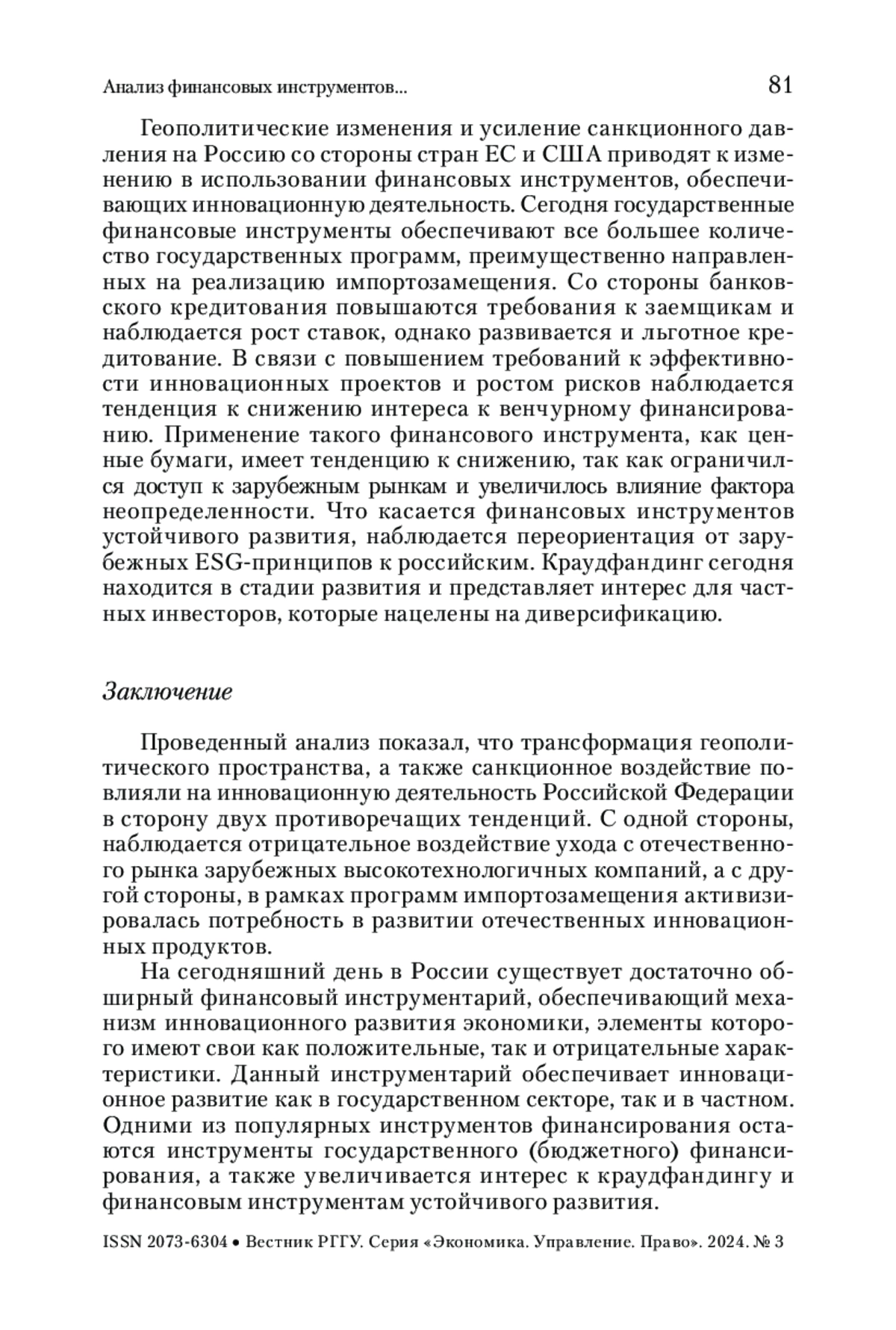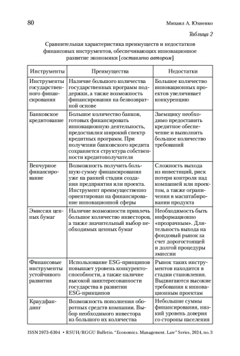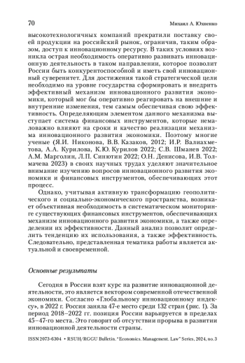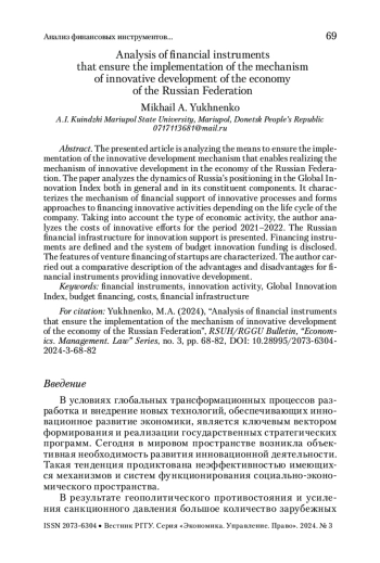 Представленная статья посвящена анализу инструментов, обеспечивающих реализацию механизма инновационного развития экономики Российской Федерации. В работе проанализирована динамика позиции России в «Глобальном инновационном индексе» как в целом, так и по составляющим его компонентам. Охарактеризован механизм финансового обеспечения инновационных процессов. Сформированы подходы финансирования инновационной деятельности в зависимости от жизненного цикла компании. С учетом вида экономической деятельности автором проведен анализ затрат на инновационную деятельность за период 2021–2022 гг. Представлена российская финансовая инфраструктура поддержки инноваций. Определены инструменты финансирования инновационной деятельности. Раскрыта система бюджетного финансирования инновационной деятельности. Охарактеризованы особенности венчурного финансирования стартапов. Автором проведена сравнительная характеристика преимуществ и недостатков финансовых инструментов, обеспечивающих инновационное развитие. Приведены современные тенденции применения финансовых инструментов с учетом геополитических изменений и санкционного давления на Российскую Федерацию.
