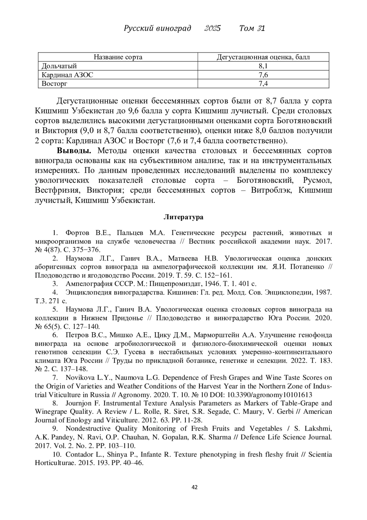 7. Novikova L.Y., Naumova L.G. Dependence of Fresh Grapes and Wine Taste Scores on the Origin of Varieties and Weather Conditions of the Harvest Year in the Northern Zone of Indus-trial Viticulture in Russia // Agronomy. 2020. Т. 10. № 10 DOI: 10.3390/agronomy10101613