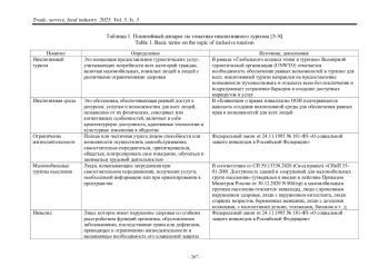 анализ понятийного аппарата по теме исследования: инклюзивный туризм, инклюзивная среда, ограничения жизнедеятельности, маломобильные группы населения, инвалидность. Рассматривается связь реализации государственной политики в сфере развития туризма и основных направлений обеспечения доступности разным категориям граждан, в том числе с особыми потребностями.
