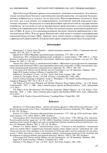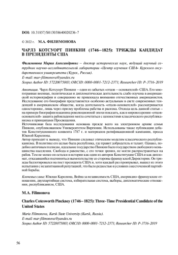 Чарлз Котсуорт Пинкни – один из забытых «отцов – основателей» США. Его многогранная военная, политическая и дипломатическая деятельность слабо изучена в американской историографии и совершенно не привлекала внимания отечественных американистов. Исследование его биографии представляется особенно актуальным в свете современных тенденций в американском обществе, когда деятельность «отцов-основателей» рассматривается односторонне, лишь через призму проблемы рабства и расизма. Отсюда цель данной статьи – на примере биографии южанина революционной эпохи показать, как в мировоззрении «отцовоснователей» защита рабовладения могла сочетаться с ценностями классического республиканизма и принципами Просвещения.