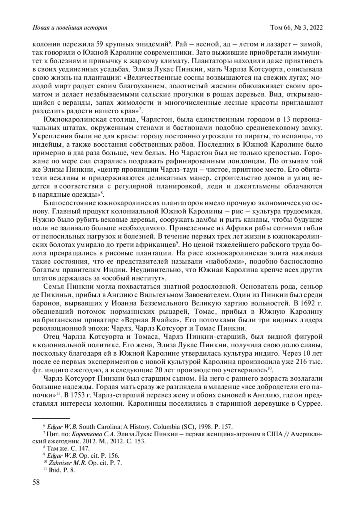 Южная Каролина XVIII в. в какой-то мере находится в тени блистательного «виргинского ренессанса». Культура этого своеобразного штата, его вклад в становление американской государственности, его лидеры остаются своего рода «белым пятном» американской историографии. Чарлз Котсуорт Пинкни – один из самых ярких южнокаролинцев революционной эпохи – почти не привлекал внимания историков. Ему посвящена лишь одна монография за авторством Марвина Занисера, который рассматривал жизненный путь Пинкни в контексте становления первой двухпартийной системы 1. В отечественной историографии Пинкни упоминался лишь при анализе американофранцузских отношений 1790-х годов