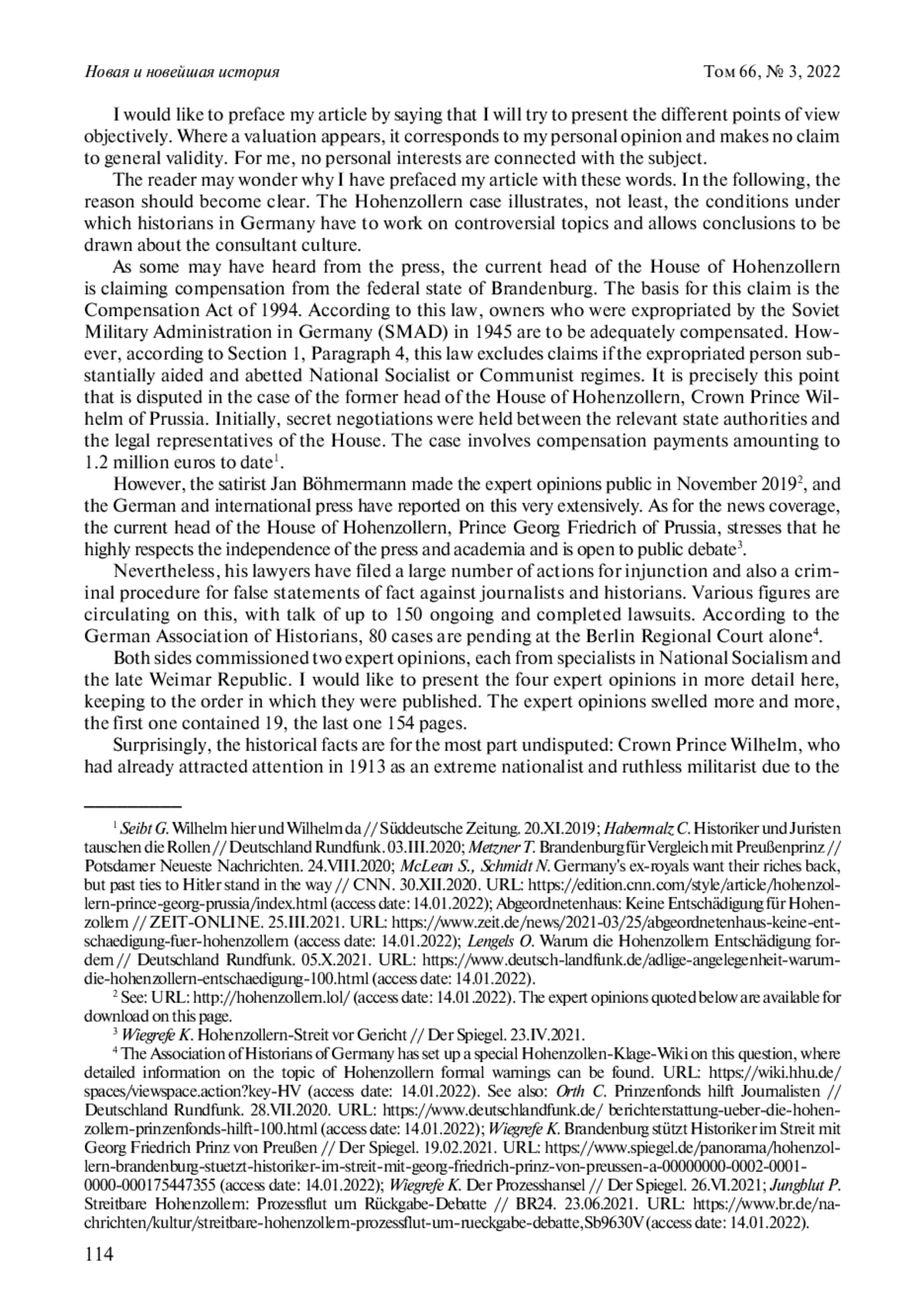 1. Brandt P., Pache J. Gutachten zur politischen Einstellung und zum politischen Verhalten des ehemaligen preußischen und reichsdeutschen Kronprinzen Wilhelm. 20.08.2014 // URL: http://hohenzollern.lol/gutachten/brandt.pdf (access date: 14.01.2022).