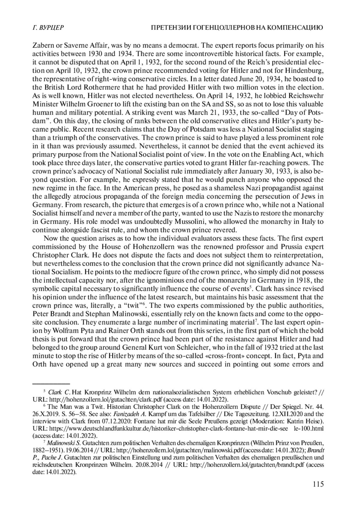 2. Clark C. Hat Kronprinz Wilhelm dem nationalsozialistischen System erheblichen Vorschub geleistet? // URL: http://hohenzollern.lol/gutachten/clark.pdf (access date: 14.01.2022).