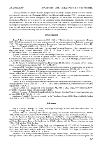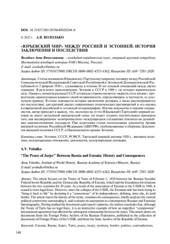 ВОЛОДЬКО А. В. "ЮРЬЕВСКИЙ МИР" МЕЖДУ РОССИЕЙ И ЭСТОНИЕЙ: ИСТОРИЯ ЗАКЛЮЧЕНИЯ И ПОСЛЕДСТВИЯ // НОВАЯ И НОВЕЙШАЯ ИСТОРИЯ. 2022. № 3