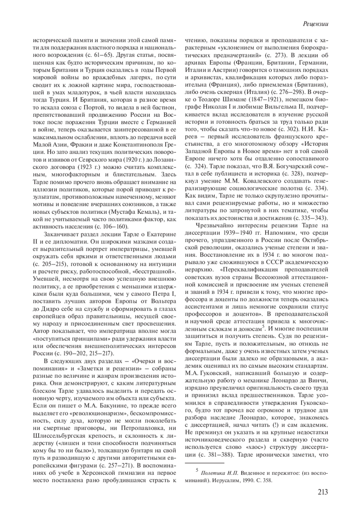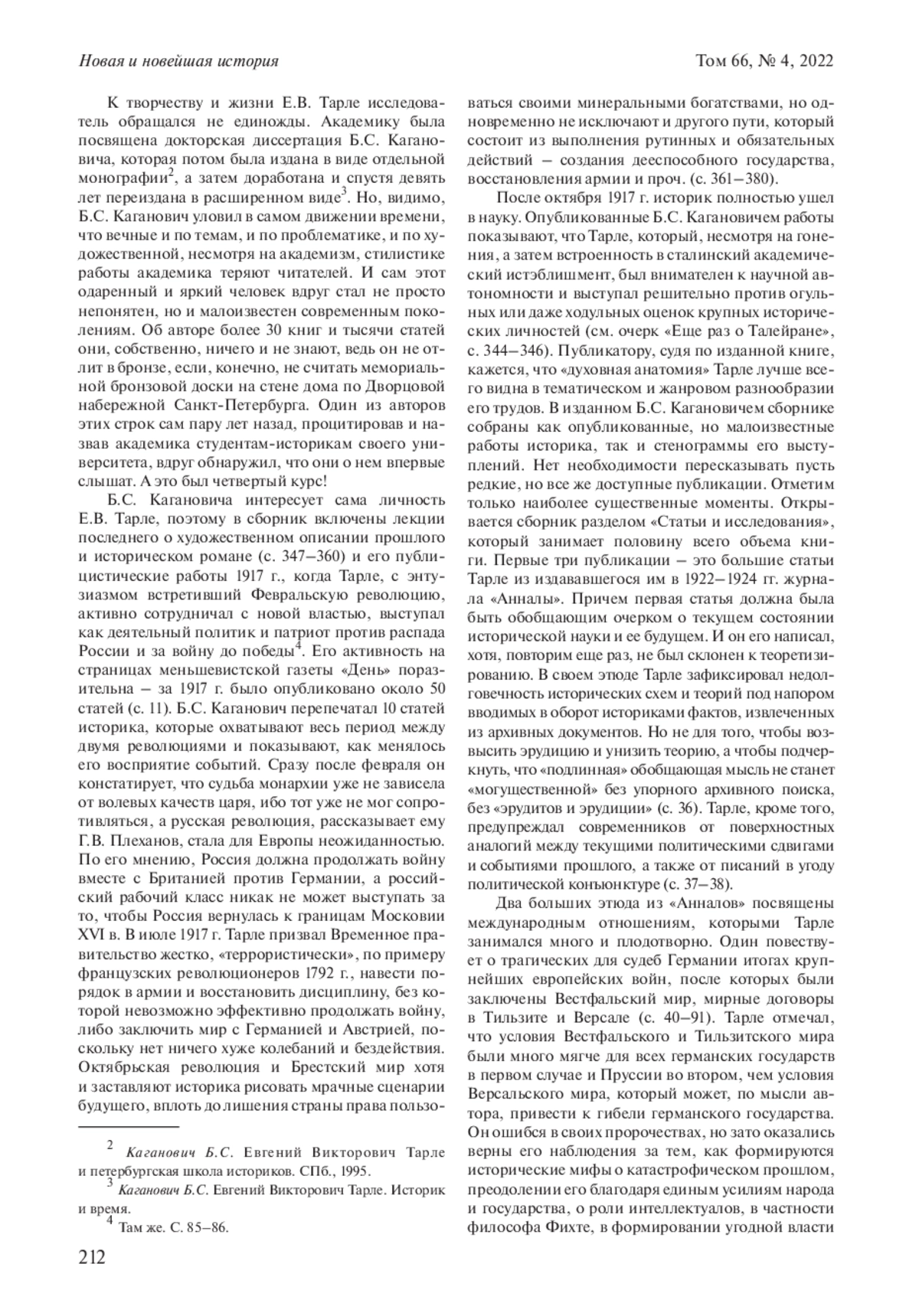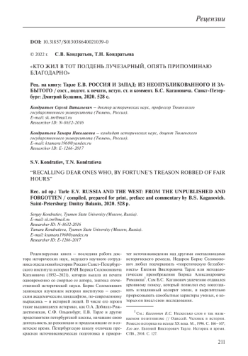 КОНДРАТЬЕВ С. В., КОНДРАТЬЕВА Т. Н. "КТО ЖИЛ В ТОТ ПОЛДЕНЬ ЛУЧЕЗАРНЫЙ, ОПЯТЬ ПРИПОМИНАЮ БЛАГОДАРНО" (ТАРЛЕ Е. В. РОССИЯ И ЗАПАД: ИЗ НЕОПУБЛИКОВАННОГО И ЗАБЫТОГО / СОСТ., ПОДГОТ. К ПЕЧАТИ, ВСТУП. СТ. И КОММЕНТ. Б. С. КАГАНОВИЧА. САНКТ-ПЕТЕРБУРГ, 2020) // НОВАЯ И НОВЕЙШАЯ ИСТОРИЯ. 2022. № 4