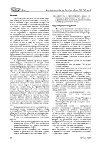 Проблема обращения с твёрдыми коммунальными отходами в России становится всё более актуальной, требуя внедрения эффективных территориально-ориентированных решений. В статье анализируются вопросы оптимизации размещения объектов сбора и переработки твёрдых коммунальных отходов на примере Балашовского района Саратовской области. Основное внимание уделяется использованию методов линейного программирования и геоинформационного моделирования для выбора оптимальных мест размещения мусороперерабатывающих заводов. Применение ГИС-технологий и методов пространственного анализа позволило провести зонирование территории и оценку экологических рисков. Разработана оптимальная схема размещения объектов сбора и переработки твёрдых коммунальных отходов для Балашовского района Саратовской области. Предложенная схема позволяет минимизировать затраты на транспортировку отходов и максимизировать эффективность их переработки, что способствует созданию более устойчивой и экономически выгодной системы обращения с отходами в регионе.