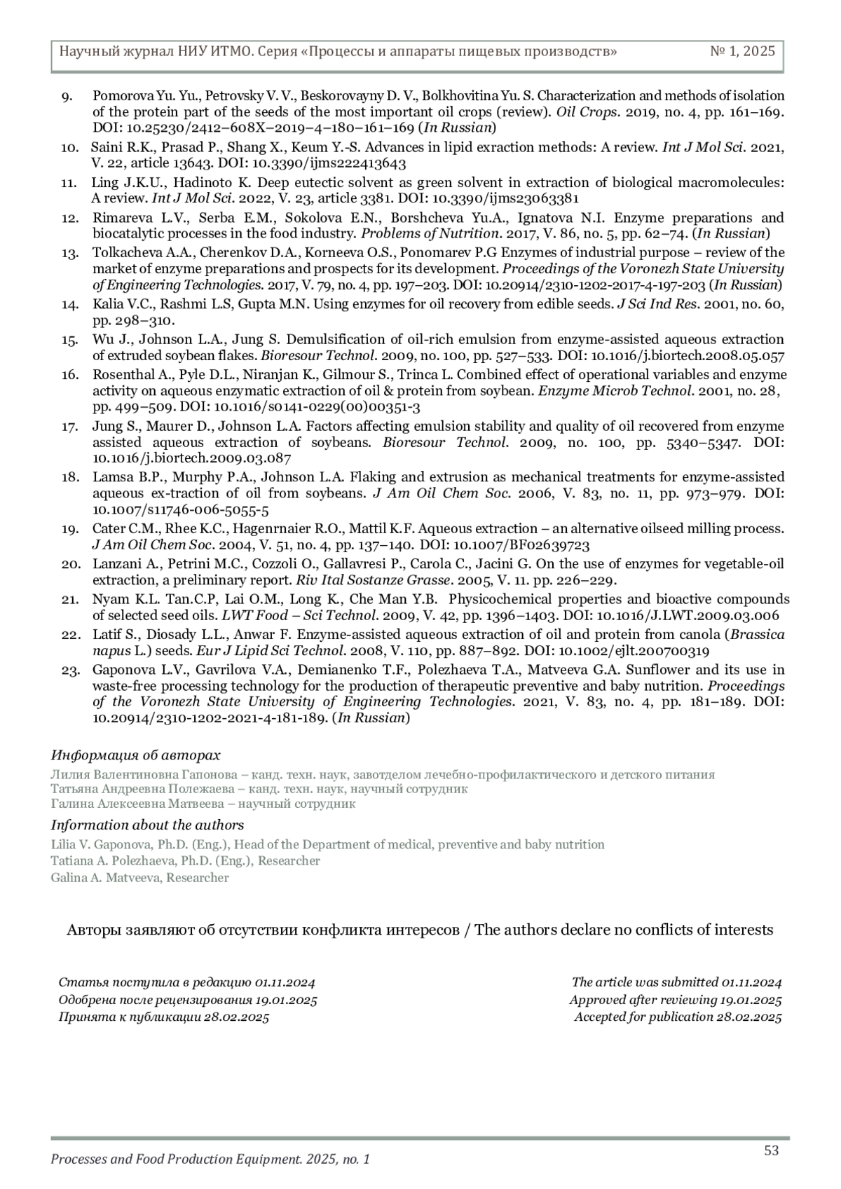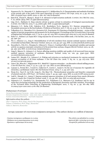 23. Гапонова Л.В., Гаврилова В.А., Демьяненко Т.Ф., Полежаева Т.А., Матвеева Г.А. Подсолнечник и использование его в безотходной технологии переработки с целью производства продуктов лечебно-профилактического и детского питания // Вестник Воронеж. гос. ун-та инженерных технологий 2021. Т. 83. С. 181-189.