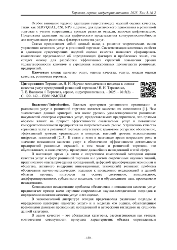 23. Терещенко, Н. Н. Оценка сервисных услуг предприятиями розничной торговли в современных условиях [Текст] / Н. Н. Терещенко, Т. Е. Васинева // Торговля, сервис, индустрия питания. – 2024. – № 4. – С. 352–361.