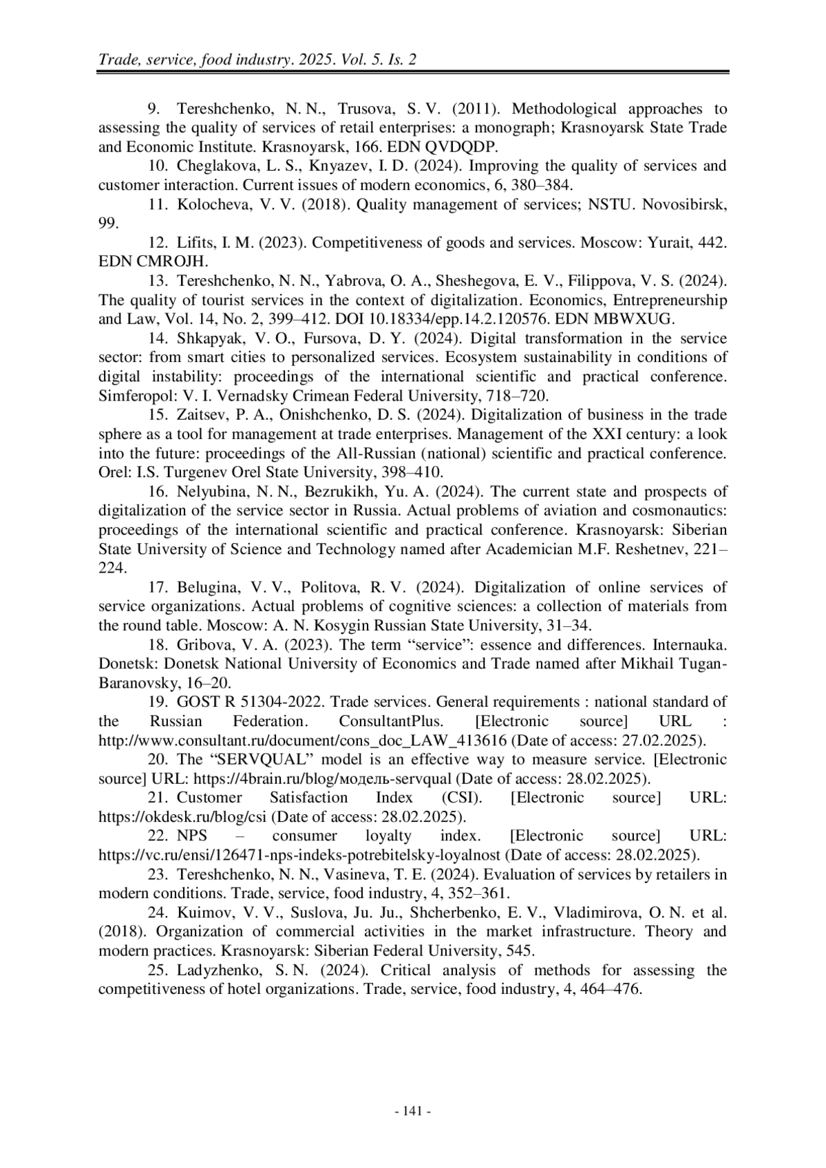 25. Ладыженко, С. Н. Критический анализ методик оценки конкурентоспособности гостиничных организаций [Текст] / С. Н. Ладыженко // Торговля, сервис, индустрия питания. – 2024. – №. 4. – С. 464–476.