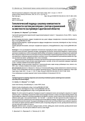 ДАНИЛОВ В. А., МОРОЗОВА В. А., ПАПИЛИН Д. В. ТОПОЛОГИЧЕСКИЙ ПОДХОД К АНАЛИЗУ КОМПАКТНОСТИ И СВЯЗНОСТИ СИСТЕМ РАССЕЛЕНИЯ С УЧЕТОМ ОГРАНИЧЕНИЙ НА МЕСТНОСТИ (НА ПРИМЕРЕ САРАТОВСКОЙ ОБЛАСТИ) // ИЗВЕСТИЯ САРАТОВСКОГО УНИВЕРСИТЕТА. НОВАЯ СЕРИЯ. СЕРИЯ НАУКИ О ЗЕМЛЕ. 2025. Т. 25 № 3