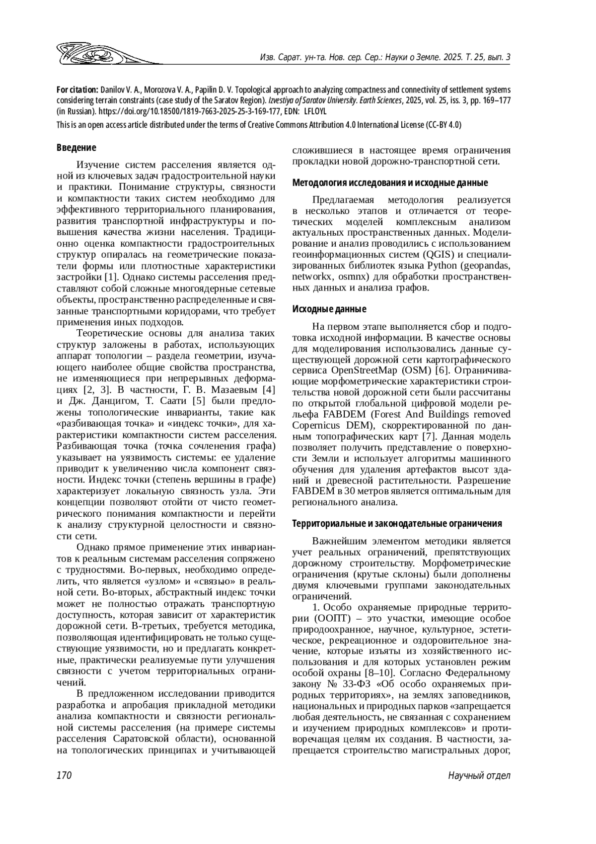 Статья: ТОПОЛОГИЧЕСКИЙ ПОДХОД К АНАЛИЗУ КОМПАКТНОСТИ И СВЯЗНОСТИ СИСТЕМ РАССЕЛЕНИЯ С УЧЕТОМ ОГРАНИЧЕНИЙ НА МЕСТНОСТИ (НА ПРИМЕРЕ САРАТОВСКОЙ ОБЛАСТИ) (2025)