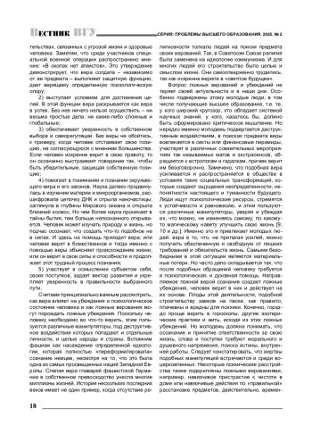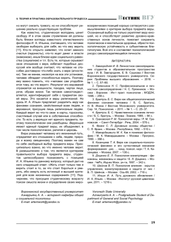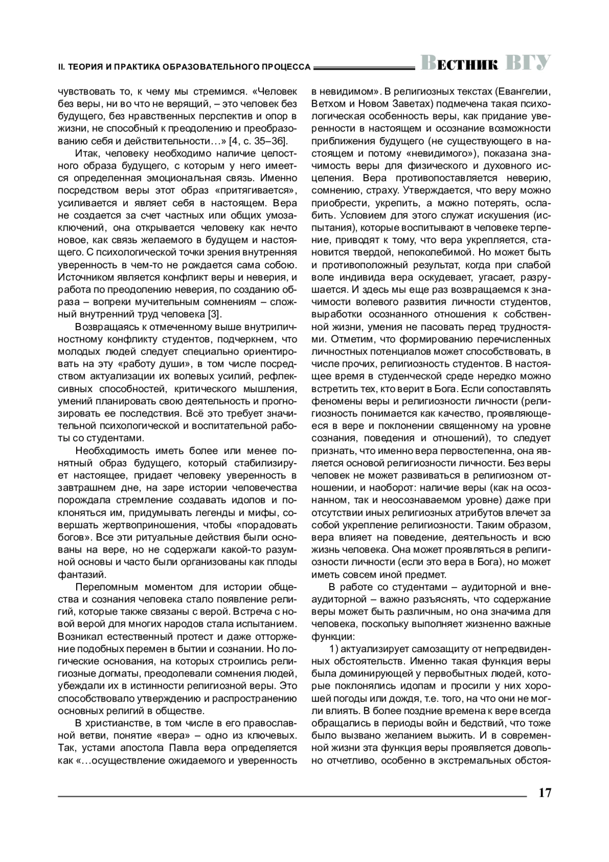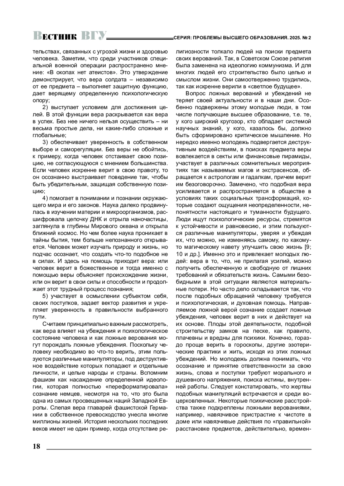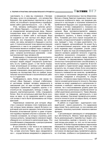 В статье обсуждается проблема такого психологического ресурса самоопределения в студенческом возрасте, как вера. Раскрывается сущность веры в ее психологическом смысле, многопредметность и многофункциональность веры как сложного личностного образования, пронизывающего сознание, деятельность, мотивационную и эмоционально-волевую сферы, описываются основные различия между религиозной и нерелигиозной верой. Определены некоторые направления воспитательной и психологической работы со студентами, испытывающими дефицит веры, что препятствует их эффективному самоопределению.