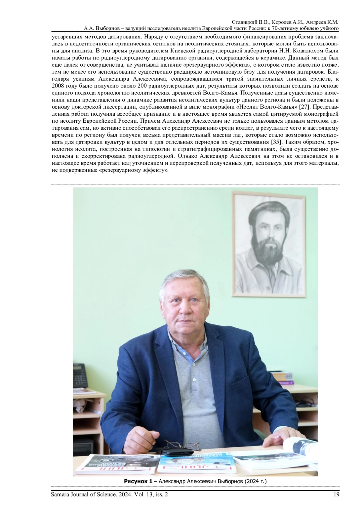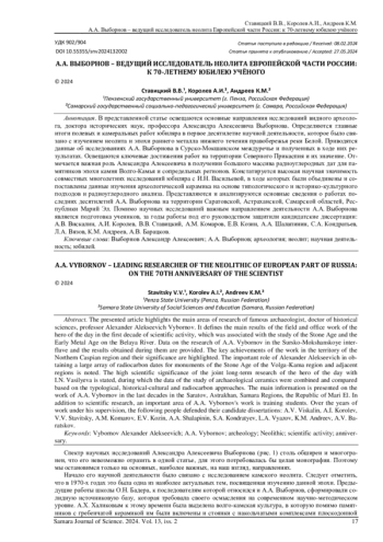 В представленной статье освещаются основные направления исследований видного археолога, доктора исторических наук, профессора Александра Алексеевича Выборнова. Определяются главные итоги полевых и камеральных работ юбиляра в первое десятилетие научной деятельности, которое было связано с изучением неолита и эпохи раннего металла нижнего течения правобережья реки Белой. Приводятся данные об исследованиях А. А. Выборнова в Сурско-Мокшанском междуречье и полученных в ходе них результатах. Освещаются ключевые достижения работ на территории Северного Прикаспия и их значение. Отмечается важная роль Александра Алексеевича в получении большого массива радиоуглеродных дат для памятников эпохи камня Волго-Камья и сопредельных регионов. Констатируется высокая научная значимость совместных многолетних исследований юбиляра с И. Н. Васильевой, в ходе которых были объединены и сопоставлены данные изучения археологической керамика на основе типологического и историко-культурного подходов и радиоуглеродного анализа. Представляются и анализируются основные сведения о работах последних десятилетий А. А. Выборнова на территории Саратовской, Астраханской, Самарской областей, Республики Марий Эл. Помимо научных исследований важным направлением деятельности А. А. Выборнова является подготовка учеников, за годы работы под его руководством защитили кандидатские диссертации: А. В. Вискалин, А. И. Королев, В. В. Ставицкий, А. М. Комаров, Е. В. Козин, А. А. Шалапинин, С. А. Кондратьев, Л. А. Вязов, К. М. Андреев, А. В. Барацков.